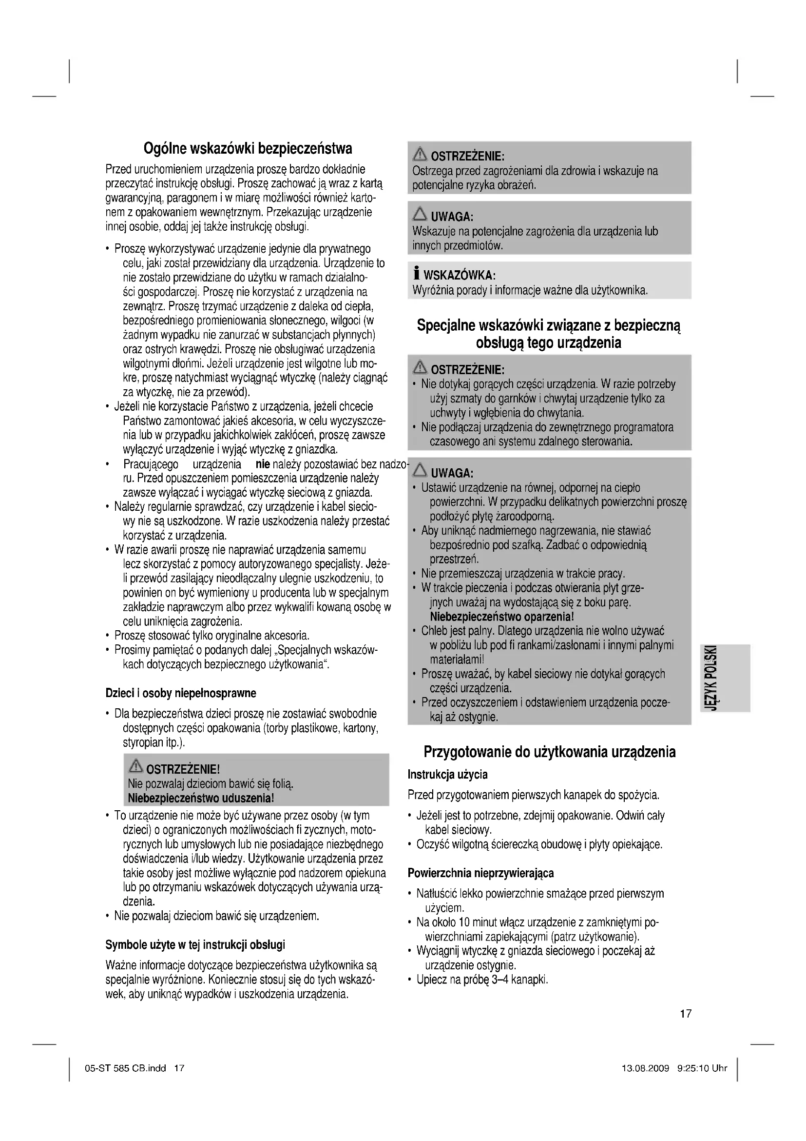 Nabywcy przysługuje prawo do wymiany urządzenia na wolne od wad lub, jeśli wymiana jest niemożliwa, zwrotu gotówki tylko po dostarczeniu do punktu zakupu kompletnego urządzenia z oryginalnymi akcesoriami, instrukcją obsługi i w oryginalnym opakowaniu wraz z dowodem zakupu i prawidłowo wypeł- nioną kartą gwarancyjną (pieczątka sklepu, data sprzedaży urządzenia). Gwarancja oraz zawarte w niej warunki obowiązują na terenie Rzeczpospolitej Polskiej. Niniejsza gwarancja nie wyłącza, nie ogranicza ani nie zawiesza uprawnień Nabywcy wynikających z przepisów Ustawy z dnia 27 lipca 2002 r. o szczególnych warunkach sprzedaży konsumenc- kiej oraz o zmianie kodeksu cywilnego (Dz. U. z 2002 r. Nr 141, poz. 1176). Znaczenie symbolu „Pojemnik na śmieci“ Proszę oszczędzać nasze środowisko, sprzęt elektryczny nie należy do śmieci domowych. Proszę korzystać z punktów zbiorczych, przewidzianych do zdawania sprzętu elektrycznego, i tam proszę oddawać sprzęt elektryczny, którego już nie będą Państwo używać. Tym sposobem pomagają Państwo unikać potencjalnych następstw niewłaściwego usuwania odpadów, mających wpływ na środowisko i zdrowie ludzi. Tą drogą przyczyniają się Państwo do ponownego użycia, do recyklingu i do innych form wykorzystania starego sprzętu elektrycznego i elektronicznego. Informacje, gdzie można zdać sprzęt, otrzymają Państwo w swoich urzędach komunalnych lub w administracji gminy. 05-ST 585 CB.indd 1905-ST 585 CB.indd 19 13.08.2009 9:25:11 Uhr13.08.2009 9:25:11 Uhr20 ČESKY ČESKY Všeobecné bezpečnostní pokyny Před uvedením tohoto přístroje do provozu si velmi pozorně pře- čtěte návod k obsluze a tento návod spolu se záručním listem, pokladním blokem a podle možností i s obalem a vnitřním vyba- vením obalu dobře uschovejte. Pokud budete přístroj předávat třetím osobám, odevzdejte jim i tento návod k obsluze.
