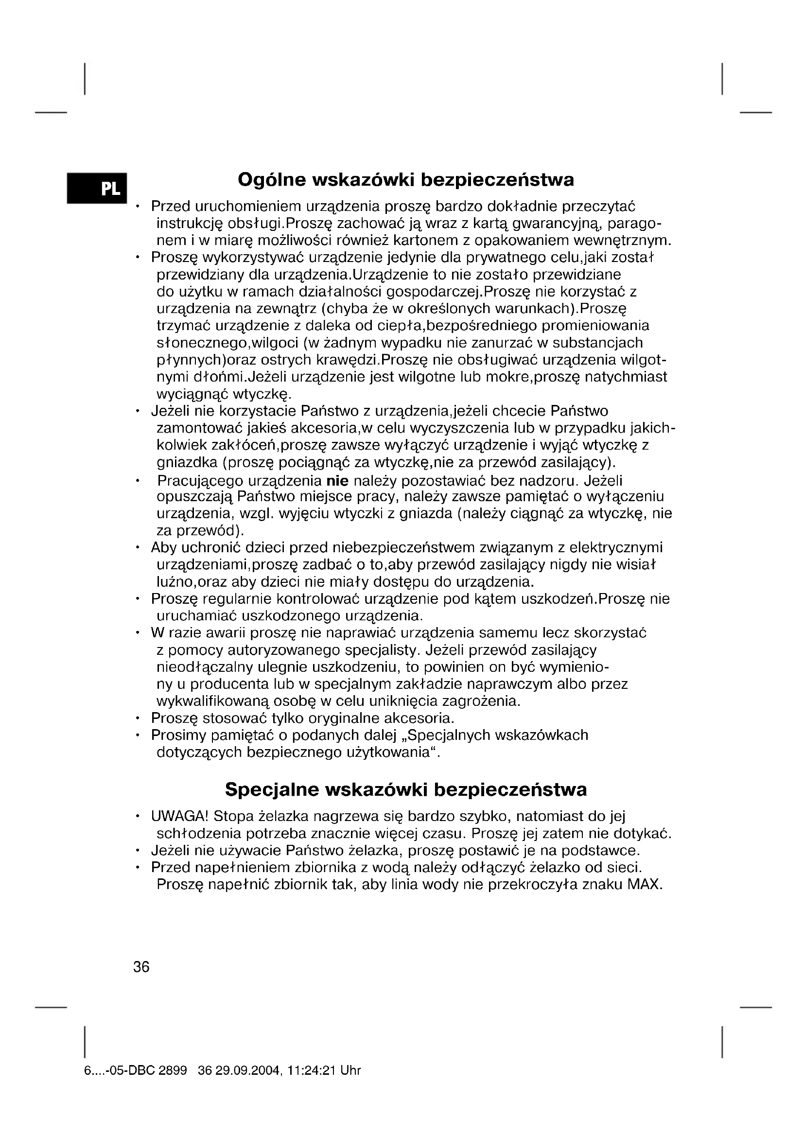 - Przed napełnieniem zbiornika z wodą należy odłączyć żelazko od sieci. Proszę napełnić zbiornik tak, aby linia wody nie przekroczyła znaku MAX. 6....-05-DBC 2899 36 29.09.2004, 11:24:21 UhrPL