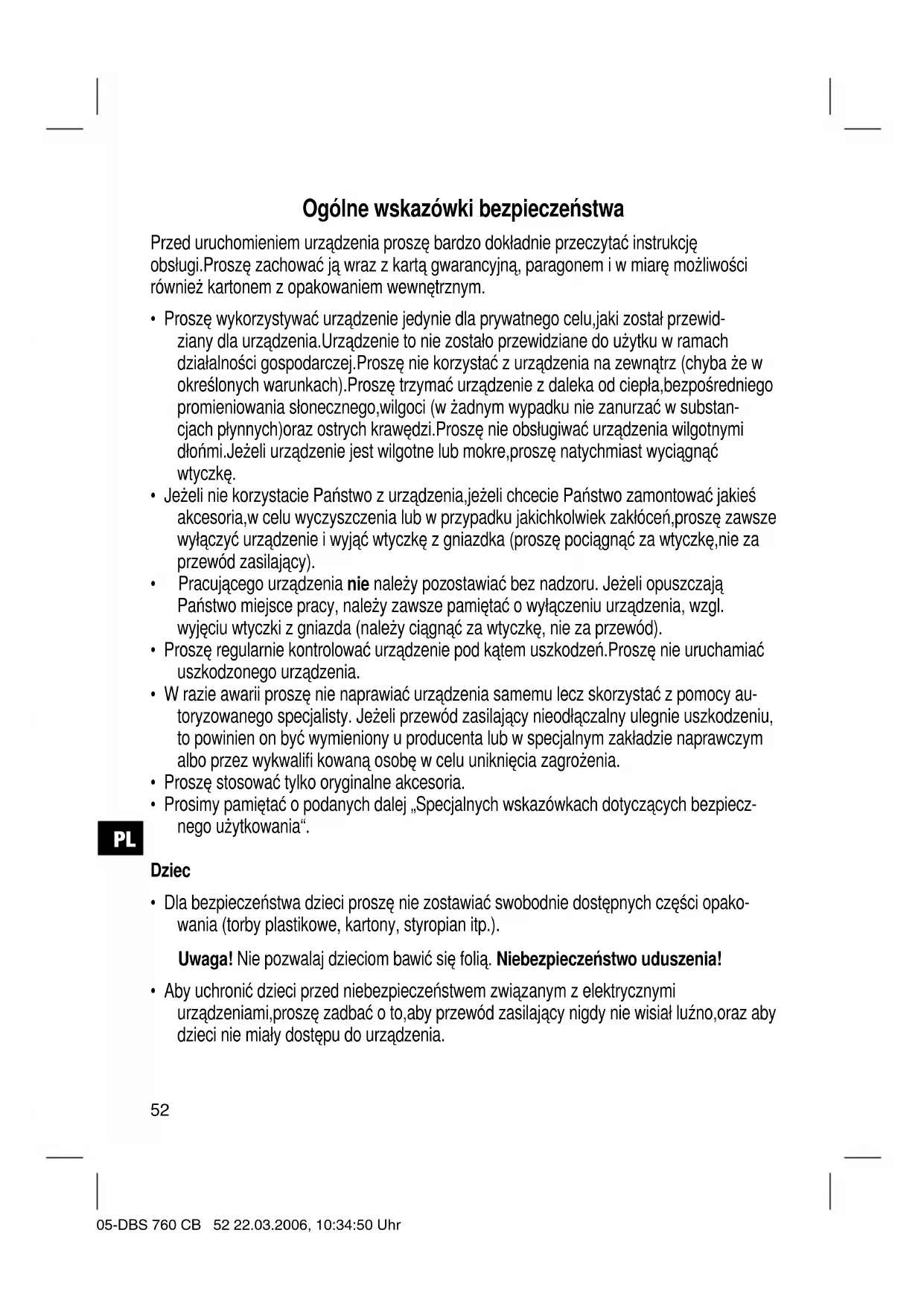 - Aby uchronić dzieci przed niebezpieczeństwem związanym z elektrycznymi urządzeniami,proszę zadbać o to,aby przewód zasilający nigdy nie wisiał luźno,oraz aby dzieci nie miały dostępu do urządzenia. 05-DBS 760 CB 52 22.03.2006, 10:34:50 UhrPL
