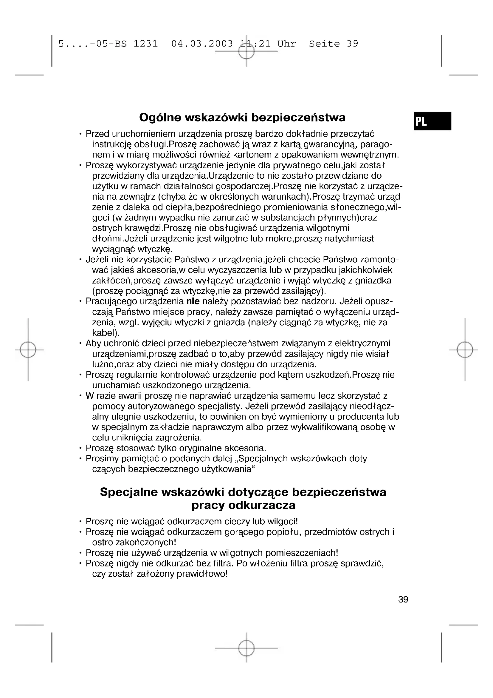 5....-05-BS 1231 04.03.2003 11:21 Uhr Seite 38Ogólne wskazówki bezpieczeństwa