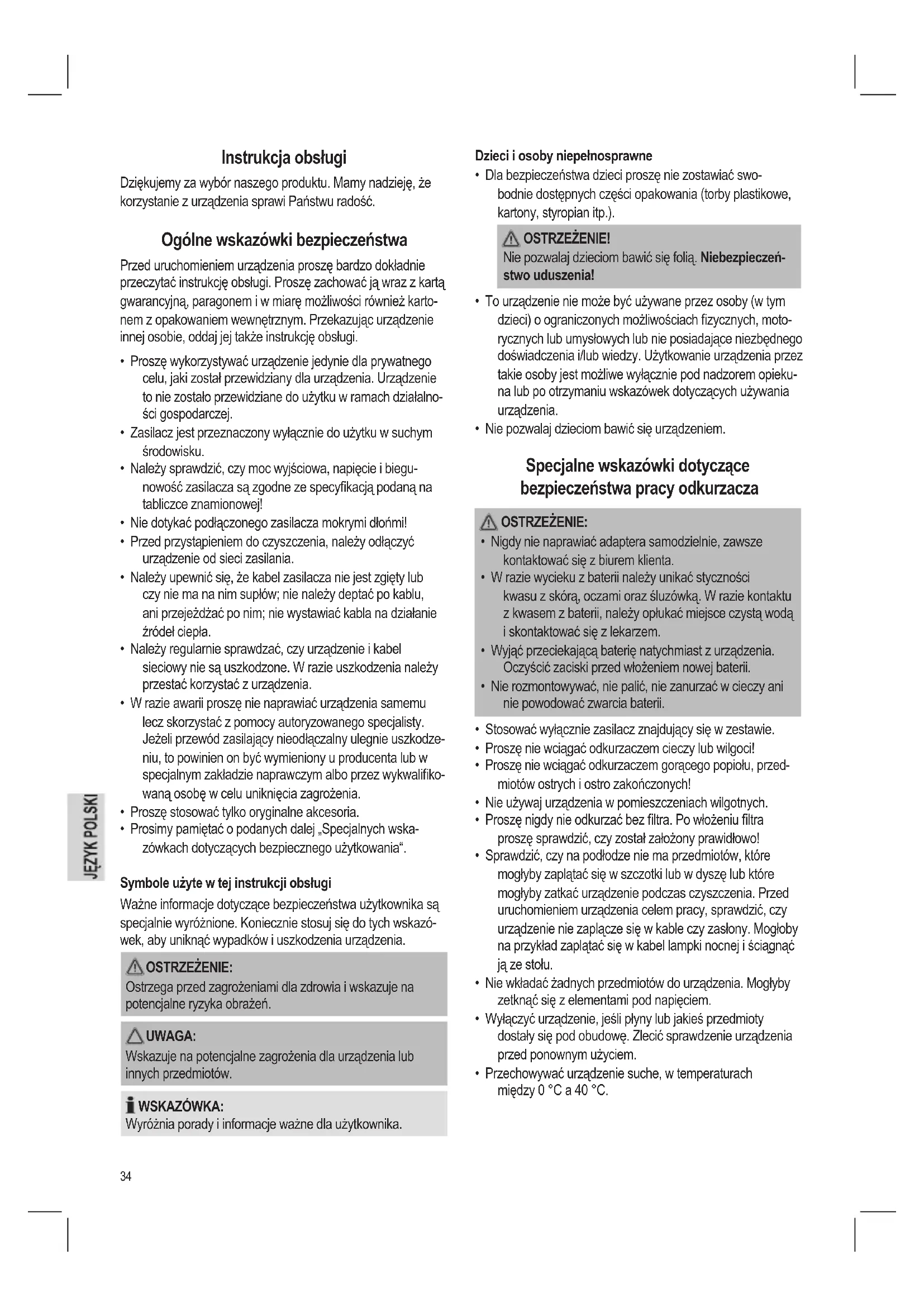 - Wyjąć paczkę baterii. Odnieść paczkę baterii do punktu zbiórki przeznaczonego dla wyczerpanych baterii. Szczegółowych informacji udzielają władze lokalne. Znaczenie symbolu „Pojemnik na śmieci“ Proszę oszczędzać nasze środowisko, sprzęt elektryczny nie należy do śmieci domowych. Proszę korzystać z punktów zbiorczych, przewidzianych do zdawania sprzętu elektrycznego, i tam proszę oddawać sprzęt elektryczny, którego już nie będą Państwo używać. Tym sposobem pomagają Państwo unikać potencjalnych następstw niewłaściwego usuwania odpadów, mających wpływ na środowisko i zdrowie ludzi. Tą drogą przyczyniają się Państwo do ponownego użycia, do recyklingu i do innych form wykorzystania starego sprzętu elektrycznego i elektronicznego. Informacje, gdzie można zdać sprzęt, otrzymają Państwo w swoich urzędach komunalnych lub w administracji gminy. Eliminowanie usterek i zakłóceń Problem Możliwa przyczyna Rozwiązanie Urządzenie nie działa Nieprawidłowo podłączona bateria. Podłączyć baterie prawidłowo (rozdział „Uruchomie- nie”). Bateria nie jest naładowana. Naładować baterię (rozdział „Uruchomienie”). Bateria nie jest naładowana. Zie- lony wskaźnik statusu nie miga. Urządzenie nie jest prawidłowo podłą- czone do adaptera i/lub adapter nie jest prawidłowo podłączony do zasilania. Podłączyć adapter prawidłowo do urządzenia oraz gniazdka ściennego. Uszkodzone gniazdko ścienne. Spróbować użyć innego gniazda. Sprawdzić bezpieczniki. Uszkodzony adapter. Skontaktować się z serwisem konsumenta. Bateria nie jest naładowana. Miga zielony wskaźnik stanu. Uszkodzone urządzenie. Skontaktować się z serwisem konsumenta. Nieprawidłowa moc ssania. Zablokowana dysza. Oczyścić dyszę. Pojemnik na kurz jest pełny. Opróżnić pojemnik kurzowy. Brudny ltr. Oczyścić ltr. Brudna szmatka do podłogi. Oczyścić lub wymienić szmatkę do podłogi.38 WARUNKI GWARANCJI Przyznajemy 24 miesiące gwarancji na produkt licząc od daty zakupu. W tym okresie będziemy bezpłatnie usuwać w terminie 14 dni od daty dostarczenia wadliwego sprzętu z kartą gwarancyjną do miejsca zakupu wszystkie uszkodzenia powstałe w tym urządzeniu na skutek wady materiałów lub wadliwego wyko- nania, naprawiając oraz wymieniając wadliwe części lub (jeśli uznamy za stosowne) wymieniając całe urządzenie na nowe. Sprzęt do naprawy powinien być dostarczony w komplecie wraz z dowodem zakupu oraz z ważną kartą gwarancyjną do sprzedawcy w miarę możliwości w oryginalnym opakowaniu lub innym odpowiednim dla zabezpieczenia przed uszkodzeniem. W razie braku kompletnego opakowania fabrycznego, ryzyko uszkodzenia sprzętu podczas transportu do i z miejsca zakupu ponosi reklamujący. Naprawa gwarancyjna nie dotyczy czynności przewidzianych w instrukcji obsługi, do wykonania których zobowiązany jest użytkownik we własnym zakresie i na własny koszt. Gwarancja nie obejmuje: mechanicznych, termicznych, chemicznych uszkodzeń sprzętu i wywołanych nimi wad,