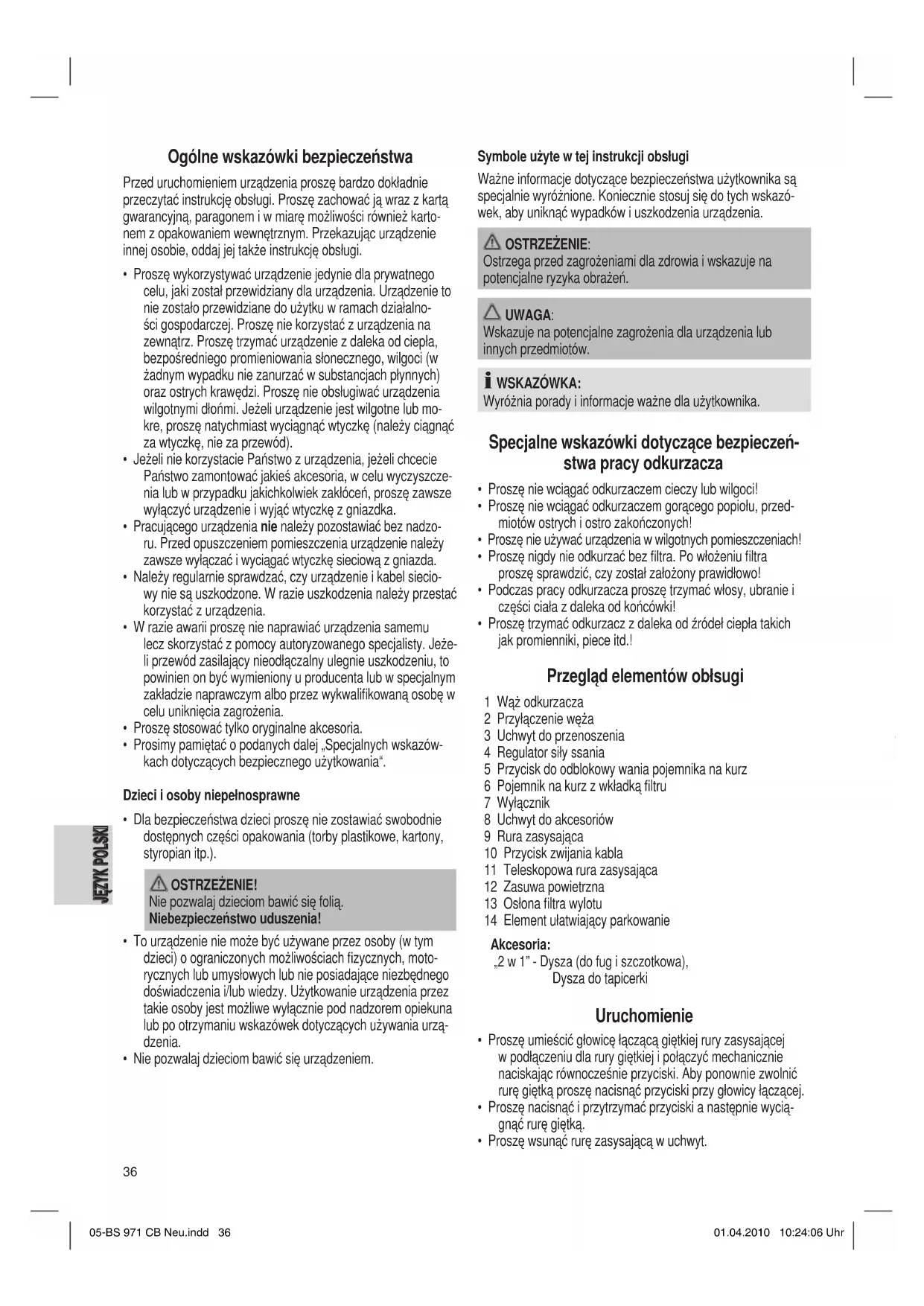 - Po zwolnieniu przycisku umożliwiającego ponowne zaryglo- wanie, powinni Państwo usłyszeć charakterystyczny dźwięk. Końcówki odkurzacza WSKAZÓWKA: Akcesoria znajdują się w uchwycie na rurze teleskopowej. Dysza do tapicerki: Do odkurzania tapicerki, zasłon oraz w rogach i szczelinach, itp. Dysza do fug i dysza szczotkowa: „2 w 1“ Dysza: złożona nadaje się do stosowania jako dysza do fug. Jeżeli chcą Państwo użyć dyszy szczotko- 05-BS 971 CB Neu.indd 36 01.04.2010 10:24:06 Uhr37