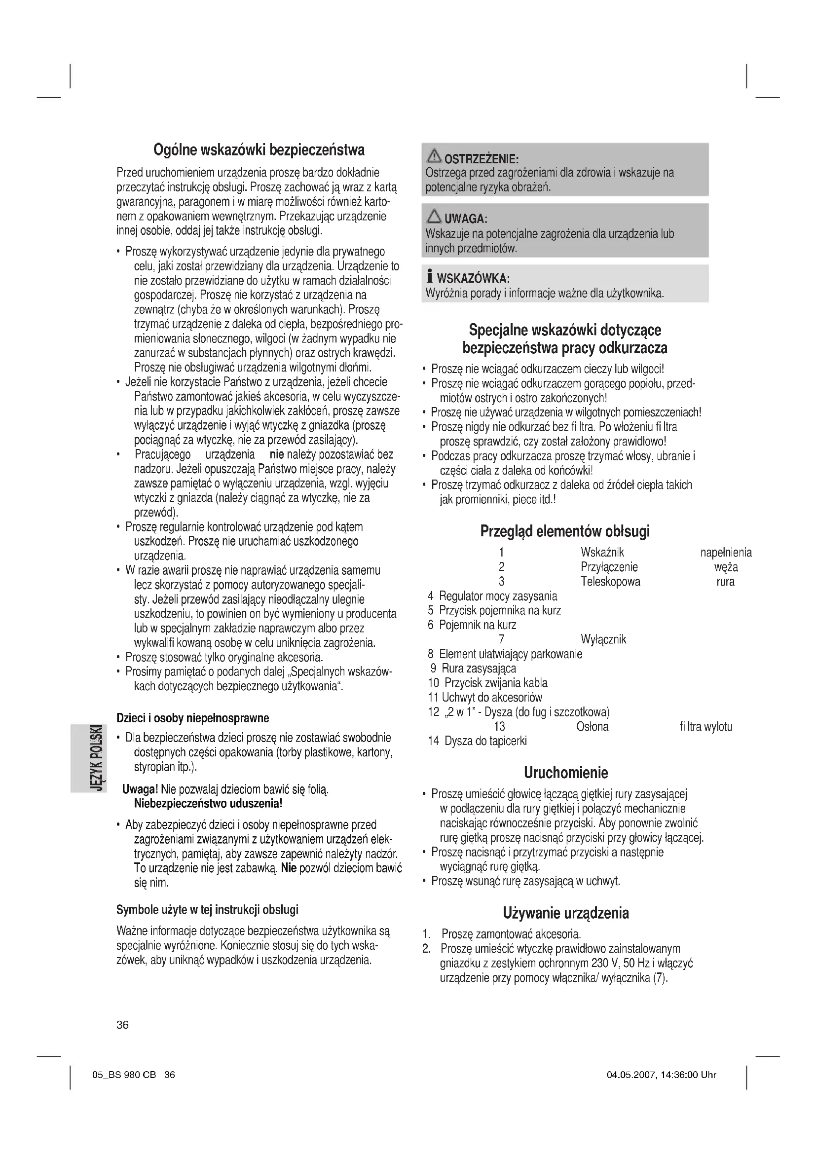 gniazdku z zestykiem ochronnym 230 V, 50 Hz i włączyć urządzenie przy pomocy włącznika/ wyłącznika (7). 05_BS 980 CB 36 04.05.2007, 14:36:00 UhrJĘZYK POLSKI