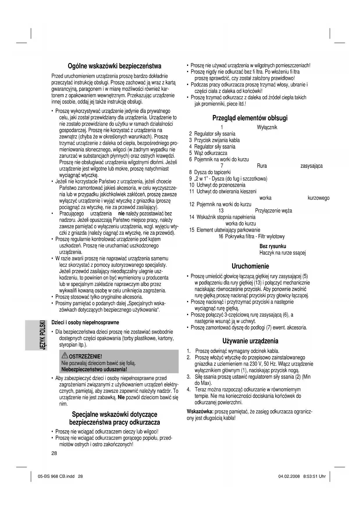 tempie. Nie ma konieczności dociskania końcówek do odkurzanej powierzchni. Wskazówka: proszę pamiętać, że zasięg odkurzacza ogranicz- ony jest długością kabla! 05-BS 968 CB.indd 2805-BS 968 CB.indd 28 04.02.2008 8:53:51 Uhr04.02.2008 8:53:51 Uhr29