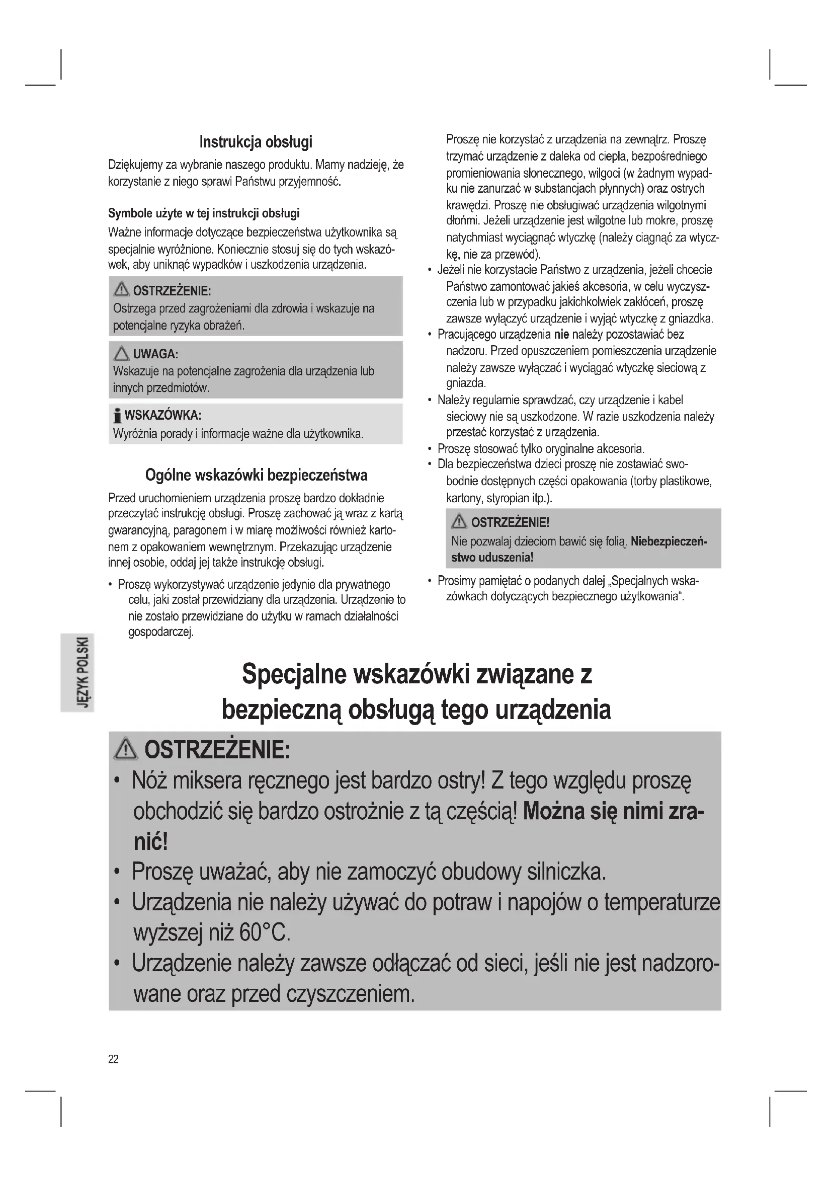- Nóż miksera ręcznego jest bardzo ostry! Z tego względu proszę obchodzić się bardzo ostrożnie z tą częścią! Można się nimi zra- nić!