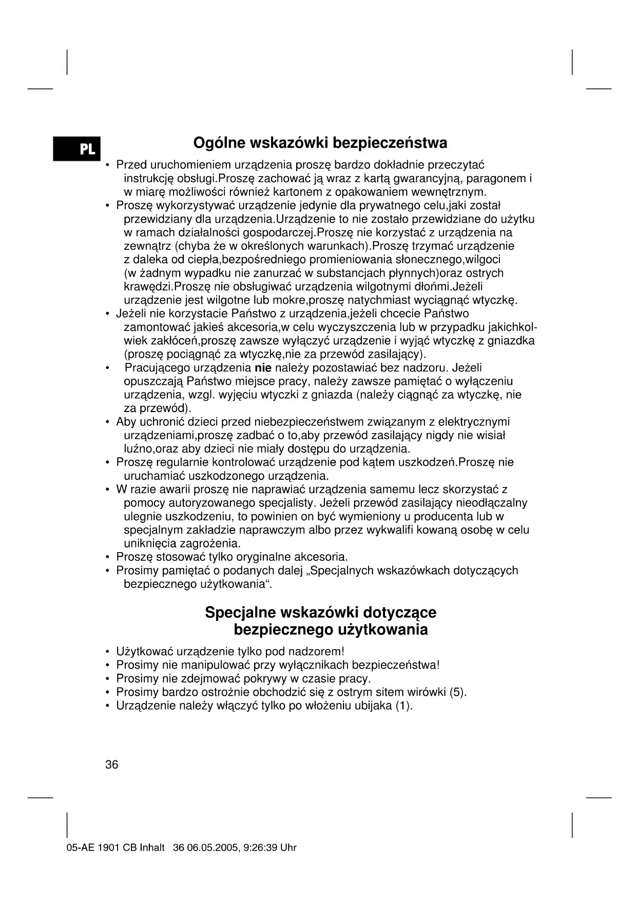 sposób przechowywane urządzenie zajmuje mniej miejsca. Niniejsze urządzenie odpowiada wymaganiom normy bezpieczeństwa użytkowania oraz spełnia wymagania dyrektywy niskonapięciowej i kompatybilności elektromagnetycznej. Zastrzega się prawo do zmian technicznych! WARUNKI GWARANCJI Przyznajemy 24 miesiące gwarancji na produkt licząc od daty zakupu. W tym okresie będziemy bezpłatnie usuwać w terminie 14 dni od daty dostarc- zenia wadliwego sprzętu z kartą gwarancyjną do miejsca zakupu wszystkie usz- kodzenia powstałe w tym urządzeniu na skutek wady materiałów lub wadliwego wykonania, naprawiając oraz wymieniając wadliwe części lub (jeśli uznamy za stosowne) wymieniając całe urządzenie na nowe. Sprzęt do naprawy powinien być dostarczony w komplecie wraz z dowodem zakupu oraz z ważną kartą gwarancyjną do sprzedawcy w miarę możliwości w oryginalnym opakowaniu lub innym odpowiednim dla zabezpieczenia przed uszkodzeniem. W razie braku kompletnego opakowania fabrycznego, ryzyko usz- kodzenia sprzętu podczas transportu do i z miejsca zakupu ponosi reklamujący. Naprawa gwarancyjna nie dotyczy czynności przewidzianych w instrukcji obsługi, 05-AE 1901 CB Inhalt 38 06.05.2005, 9:26:40 UhrPL