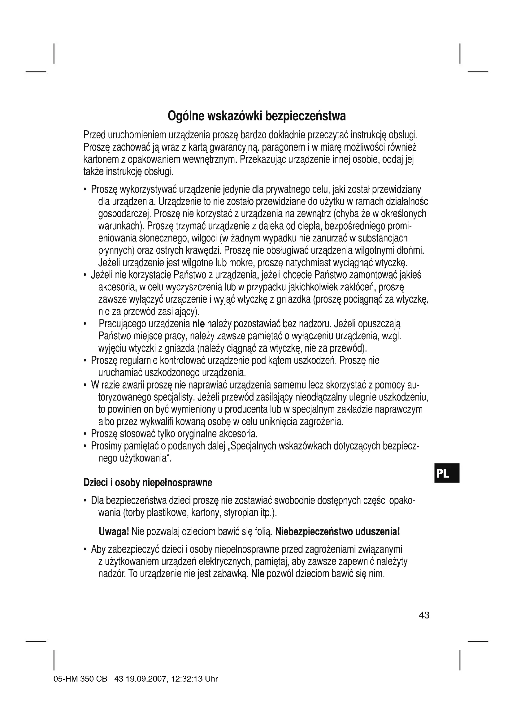 - Aby zabezpieczyć dzieci i osoby niepełnosprawne przed zagrożeniami związanymi z użytkowaniem urządzeń elektrycznych, pamiętaj, aby zawsze zapewnić należyty nadzór. To urządzenie nie jest zabawką. Nie pozwól dzieciom bawić się nim. 05-HM 350 CB 43 19.09.2007, 12:32:13 UhrPL