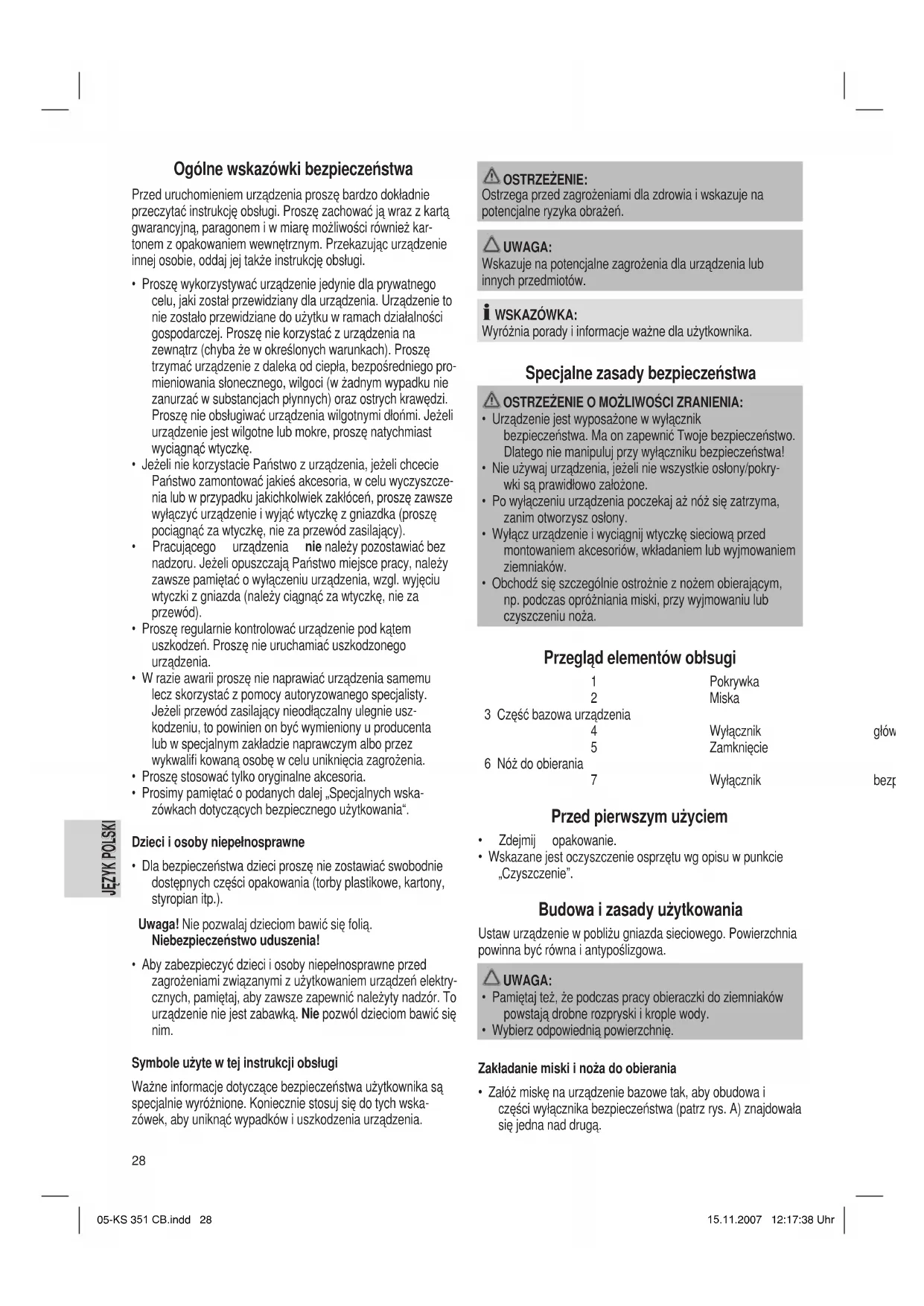 - Obchodź się szczególnie ostrożnie z nożem obierającym! Eliminowanie usterek i zakłóceń Usterka/zakłócenie Możliwa przyczyna Co robić? Urządzenie nie działa Czy urządzenie jest włączone? Sprawdź położenie wyłącznika głównego Czy gniazdko sieciowe nie jest uszkodzone? Spróbuj podłączyć do innego gniazda Nie działa wyłącznik bezpieczeństwa Sprawdź, czy miska i pokrywka są prawidłowo założone Donośne odgłosy podczas pracy Różna wielkość ziemniaków powo- duje niewyważenie Posortuj ziem- niaki i podpieraj urządzenie ręką Dane techniczne Napięcie zasilające: ..................................................230 V, 50 Hz Pobór mocy: ..........................................................................70 W Stopień ochrony: .......................................................................... Ι Masa netto:.........................................................................1,62 kg Niniejsze urządzenie odpowiada wymaganiom normy bezpieczeństwa użytkowania oraz spełnia wymagania dyrekty- wy niskonapięciowej i kompatybilności elektromagnetycznej. Zastrzega się prawo do zmian technicznych! 05-KS 351 CB.indd 29 30.10.2007 12:1715.11.2007 12:17:39 Uhr Model: ...........................................................................KS 351 CB30