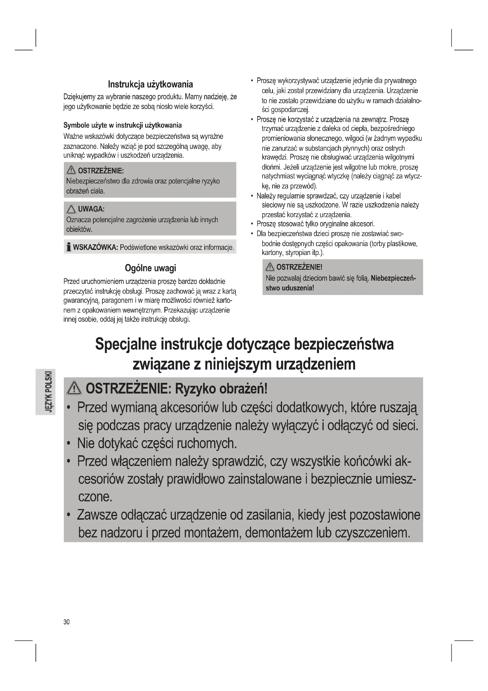 - Dla bezpieczeństwa dzieci proszę nie zostawiać swo- bodnie dostępnych części opakowania (torby plastikowe, kartony, styropian itp.). OSTRZEŻENIE! Nie pozwalaj dzieciom bawić się folią. Niebezpieczeń- stwo uduszenia! Specjalne instrukcje dotyczące bezpieczeństwa związane z niniejszym urządzeniem OSTRZEŻENIE: Ryzyko obrażeń!