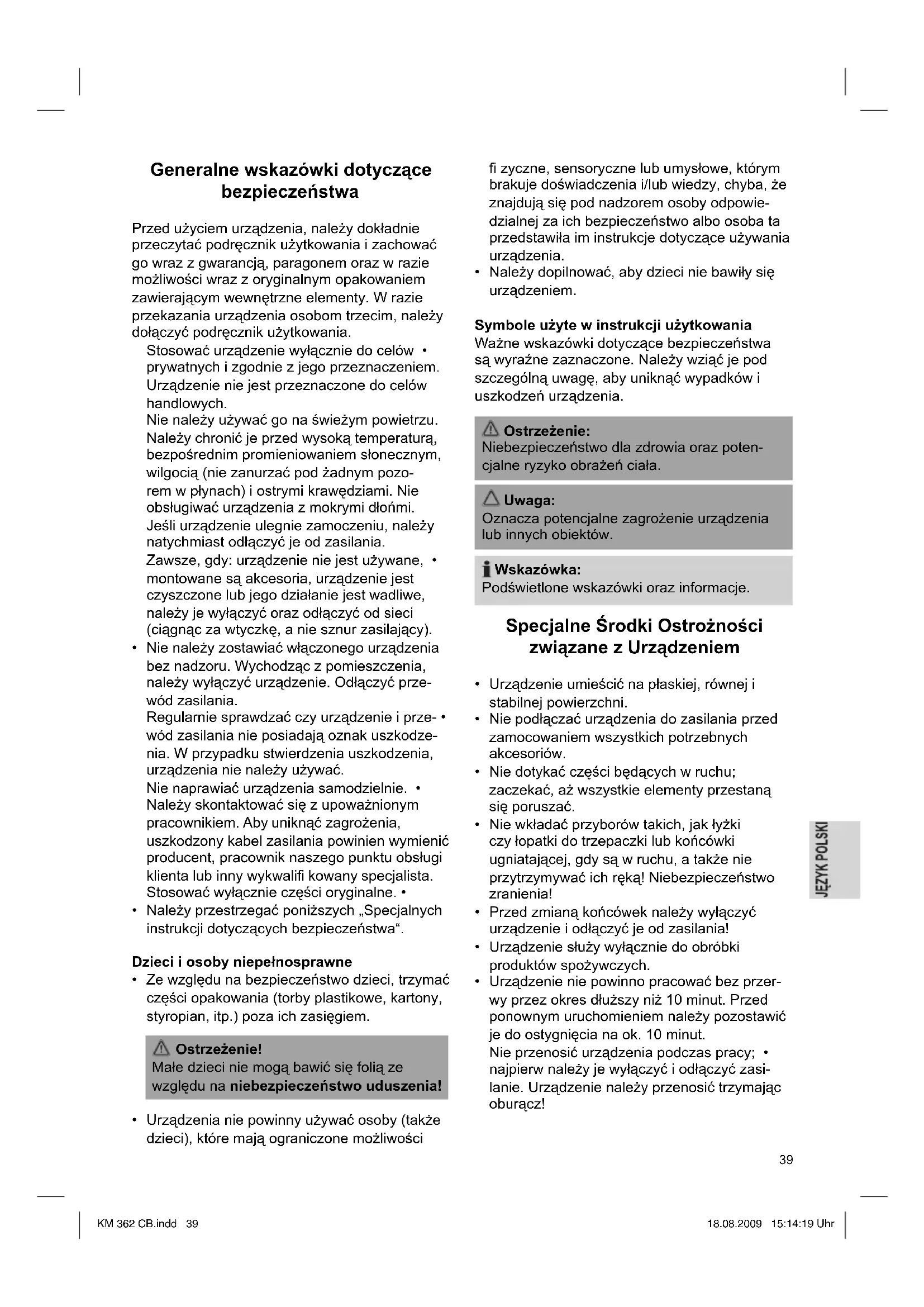 a38 Storage We recommend covering the drive shaft if the machine is stored without mixing bowl: Hold the protective cover (9) over the driveshaft, so that the white arrow ▲ stands below the white dot ●. Turn the protective cover clockwise all the way to the stop. The two white arrows ▼ and ▲ must stand opposite each other. Noise Emission The sound pressure level was measured at the ear of a user (LpA) in compliance with DIN EN ISO 3744. Determined sound pressure level: 75 - 85 dB(A) (no limit) Technical Specifi cations Model: .................................................KM 362 CB Rated voltage/frequency: .................. 230V/ 50Hz Power consumption: ..................................1000W Protection class: ................................................II Short-term operation:.......................... 10 minutes Net weight:................................................. 5.65kg Subject to change without prior notice! This device complies with all current CE direc- tives, such as electromagnetic compatibility and low voltage directive and is manufactured according to the latest safety regulations. Meaning of the “Wheelie Bin” Symbol Take care of our environment, do not dispose of electrical applicances via the household waste. Dispose of obsolete or defective electrical appli- ances via municipal collection points. Please help to avoid potential environmental and health impacts through improper waste disposal. You contribute to recycling and other forms of utilization of old electric and electronic appliances. Your municipality provides you with information about collecting points. KM 362 CB.indd 38KM 362 CB.indd 38 18.08.2009 15:14:19 Uhr18.08.2009 15:14:19 Uhr39 Generalne wskazówki dotyczące bezpieczeństwa Przed użyciem urządzenia, należy dokładnie przeczytać podręcznik użytkowania i zachować go wraz z gwarancją, paragonem oraz w razie możliwości wraz z oryginalnym opakowaniem zawierającym wewnętrzne elementy. W razie przekazania urządzenia osobom trzecim, należy dołączyć podręcznik użytkowania. Stosować urządzenie wyłącznie do celów • prywatnych i zgodnie z jego przeznaczeniem. Urządzenie nie jest przeznaczone do celów handlowych. Nie należy używać go na świeżym powietrzu. Należy chronić je przed wysoką temperaturą, bezpośrednim promieniowaniem słonecznym, wilgocią (nie zanurzać pod żadnym pozo- rem w płynach) i ostrymi krawędziami. Nie obsługiwać urządzenia z mokrymi d łońmi. Jeśli urządzenie ulegnie zamoczeniu, należy natychmiast odłączyć je od zasilania. Zawsze, gdy: urządzenie nie jest używane, • montowane są akcesoria, urządzenie jest czyszczone lub jego działanie jest wadliwe, należy je wyłączyć oraz odłączyć od sieci (ciągnąc za wtyczkę, a nie sznur zasilający). Nie należy zostawiać włączonego urządzenia • bez nadzoru. Wychodząc z pomieszczenia, należy wyłączyć urządzenie. Odłączyć prze- wód zasilania. Regularnie sprawdzać czy urządzenie i prze- • wód zasilania nie posiadają oznak uszkodze- nia. W przypadku stwierdzenia uszkodzenia, urządzenia nie należy używać. Nie naprawiać urządzenia samodzielnie. • Należy skontaktować się z upoważnionym pracownikiem. Aby uniknąć zagrożenia, uszkodzony kabel zasilania powinien wymienić producent, pracownik naszego punktu obsługi klienta lub inny wykwalifi kowany specjalista. Stosować wyłącznie części oryginalne. • Należy przestrzegać poniższych „Specjalnych • instrukcji dotyczących bezpieczeństwa“. Dzieci i osoby niepełnosprawne Ze względu na bezpieczeństwo dzieci, trzymać • części opakowania (torby plastikowe, kartony, styropian, itp.) poza ich zasięgiem. Ostrzeżenie! Małe dzieci nie mogą bawić się folią ze względu na niebezpieczeństwo uduszenia! Urządzenia nie powinny używać osoby (także • dzieci), które mają ograniczone możliwości fi zyczne, sensoryczne lub umysłowe, którym brakuje doświadczenia i/lub wiedzy, chyba, że znajdują się pod nadzorem osoby odpowie- dzialnej za ich bezpieczeństwo albo osoba ta przedstawiła im instrukcje dotyczące używania urządzenia. Należy dopilnować, aby dzieci nie bawiły się • urządzeniem. Symbole użyte w instrukcji użytkowania Ważne wskazówki dotyczące bezpieczeństwa są wyraźne zaznaczone. Należy wziąć je pod szczególną uwagę, aby uniknąć wypadków i uszkodzeń urządzenia. Ostrzeżenie: Niebezpieczeństwo dla zdrowia oraz poten- cjalne ryzyko obrażeń ciała. Uwaga: Oznacza potencjalne zagrożenie urządzenia lub innych obiektów. Wskazówka: Podświetlone wskazówki oraz informacje. Specjalne Środki Ostrożności związane z Urządzeniem Urządzenie umieścić na płaskiej, równej i • stabilnej powierzchni. Nie podłączać urządzenia do zasilania przed • zamocowaniem wszystkich potrzebnych akcesoriów. Nie dotykać części będących w ruchu; • zaczekać, aż wszystkie elementy przestaną się poruszać. Nie wkładać przyborów takich, jak łyżki • czy łopatki do trzepaczki lub końcówki ugniatającej, gdy są w ruchu, a także nie przytrzymywać ich ręką! Niebezpieczeństwo zranienia! Przed zmianą końcówek należy wyłączyć • urządzenie i odłączyć je od zasilania! Urządzenie służy wyłącznie do obróbki • produktów spożywczych. Urządzenie nie powinno pracować bez przer- • wy przez okres dłuższy niż 10 minut. Przed ponownym uruchomieniem należy pozostawić je do ostygnięcia na ok. 10 minut. Nie przenosić urządzenia podczas pracy; • najpierw należy je wyłączyć i odłączyć zasi- lanie. Urządzenie należy przenosić trzymając oburącz! KM 362 CB.indd 39KM 362 CB.indd 39 18.08.2009 15:14:19 Uhr18.08.2009 15:14:19 Uhr40 Połączenie Elektryczne Sprawdzić, czy zasilanie sieciowe odpowiada specyfi kacji podanej na etykiecie urządzenia. Lokalizacja Kontrolek 1 Panel kontrolny 2 Obrotowe ramię 3 Pokrętło do unoszenia ramienia 4 Obudowa 5 