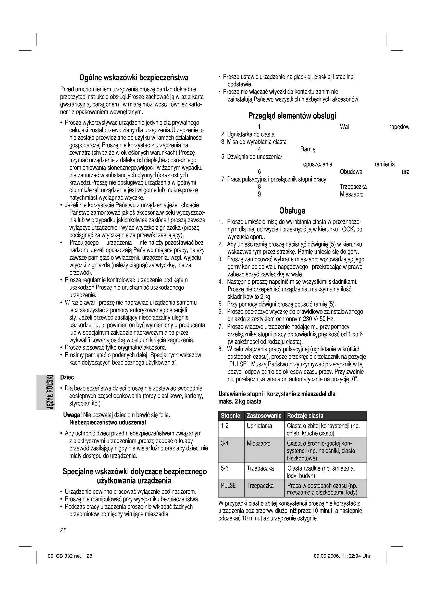 odstępach czasu), proszę przekręcić przełącznik na pozycję „PULSE”. Muszą Państwo przytrzymywać przełącznik w tej pozycji odpowiednio do okresów czasu pracy. Przy zwolnie- niu przełącznika wraca on automatycznie na pozycję „0”. Ustawianie stopni i korzystanie z mieszadeł dla maks. 2 kg ciasta Stopnie Zastosowanie Rodzaje ciasta 1-2 Ugniatarka Ciasta o zbitej konsystencji (np. chleb, kruche ciasto) 3-4 Mieszadło Ciasta o średnio-gęstej kon- systencji (np. naleśniki, ciasto biszkoptowe) 5-6 Trzepaczka Ciasta rzadkie (np. śmietana, lody, budyń) PULSE TrzepaczkaPraca w odstępach czasu (np. mieszanie z biszkoptami, lody) W przypadki ciast o zbitej konsystencji proszę nie korzystać z urządzenia bez przerwy dłużej niż przez 10 minut, a następnie odczekać 10 minut aż urządzenie ostygnie. 05_CB 332 neu 28 09.05.2006, 11:02:04 UhrJĘZYK POLSKI