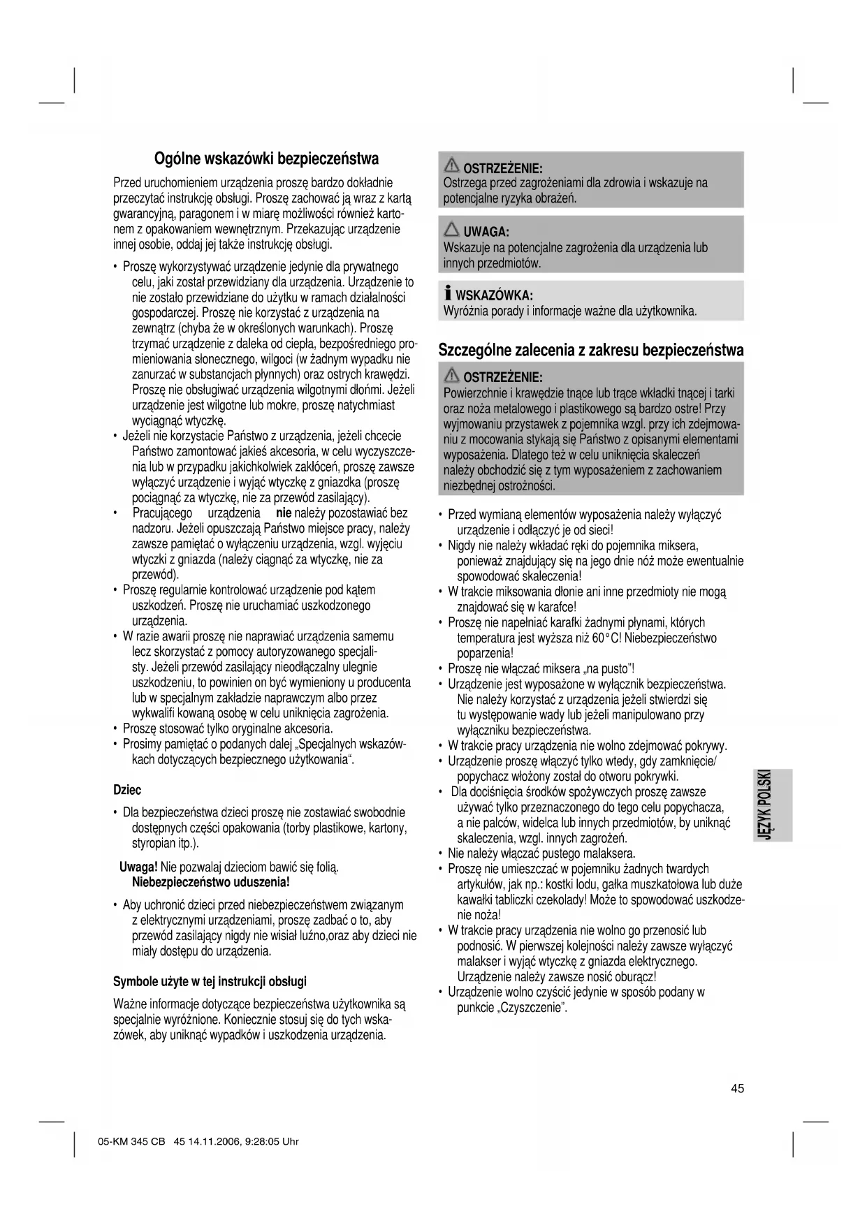- Prosimy pamiętać o podanych dalej „Specjalnych wskazów- kach dotyczących bezpiecznego użytkowania“. Dziec