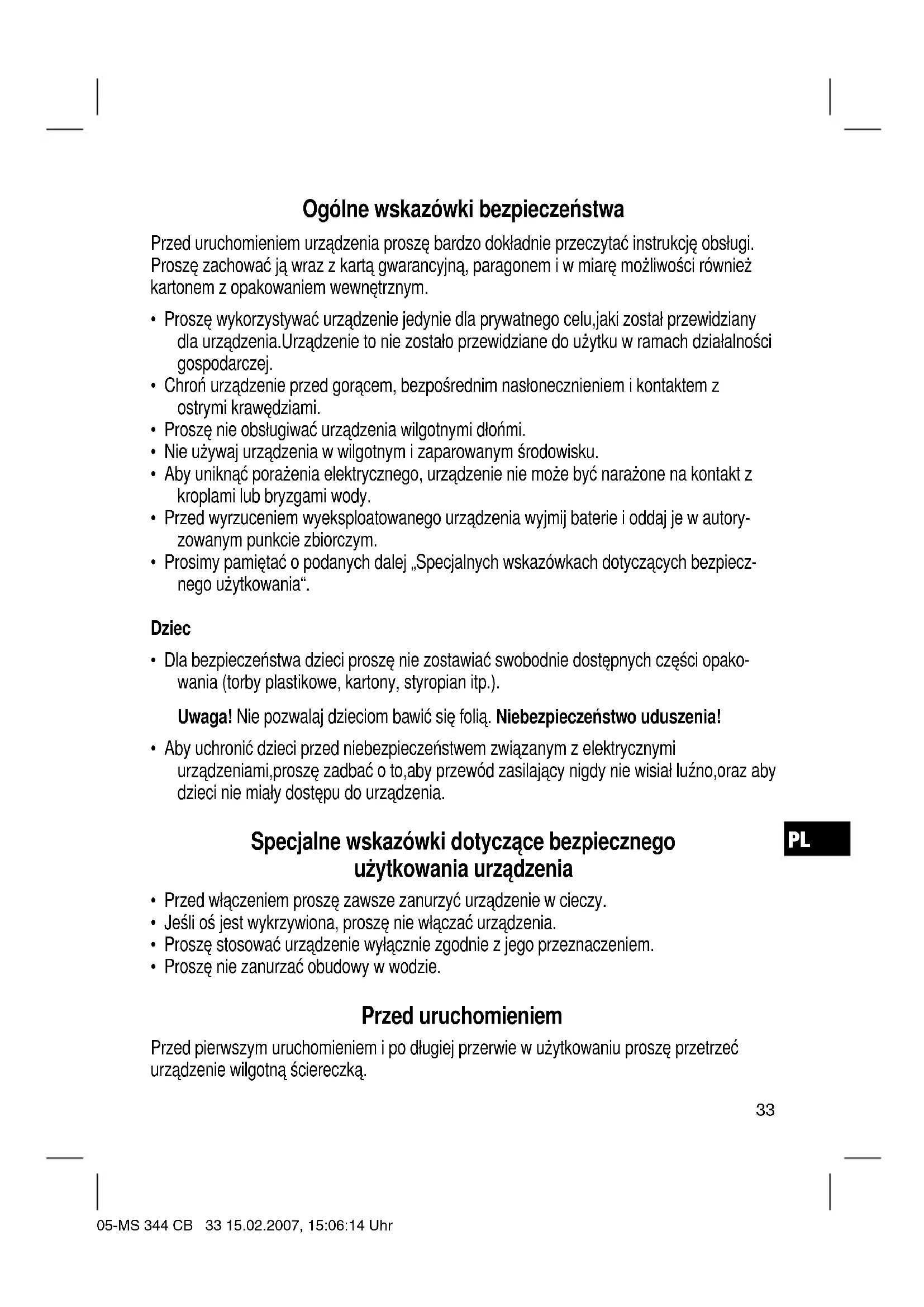- Proszę nie zanurzać obudowy w wodzie. Przed uruchomieniem Przed pierwszym uruchomieniem i po długiej przerwie w użytkowaniu proszę przetrzeć urządzenie wilgotną ściereczką. 05-MS 344 CB 33 15.02.2007, 15:06:14 UhrPL