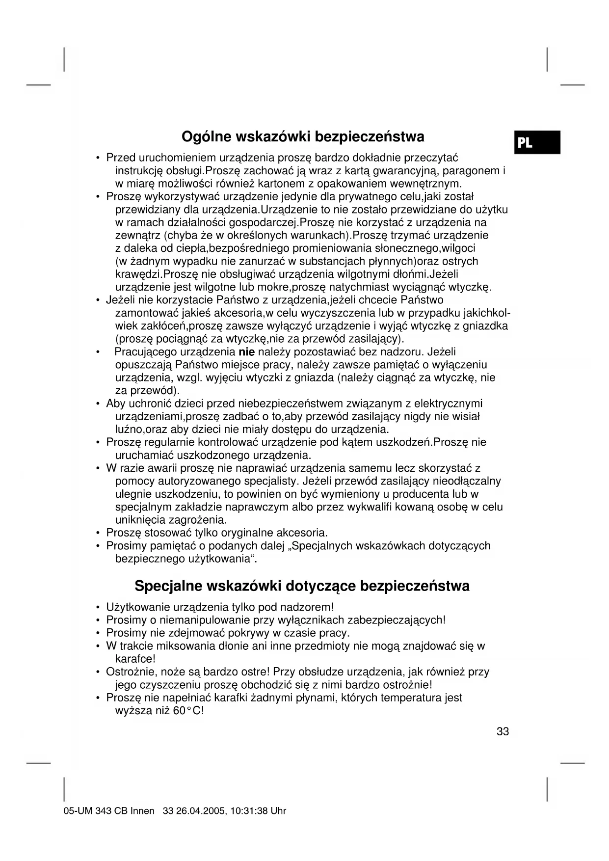 - Proszę nie napełniać karafki żadnymi płynami, których temperatura jest wyższa niż 60°C! 05-UM 343 CB Innen 33 26.04.2005, 10:31:38 UhrPL