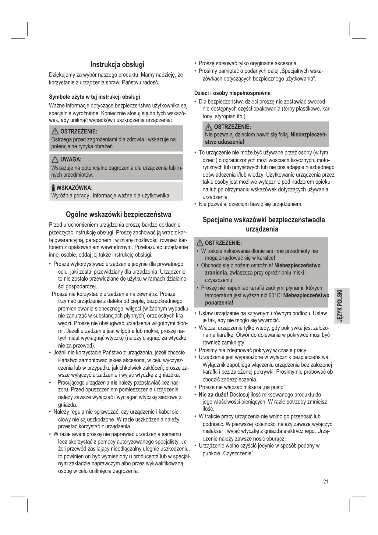 - Prosimy pamiętać o podanych dalej „Specjalnych wska- zówkach dotyczących bezpiecznego użytkowania“. Dzieci i osoby niepełnosprawne