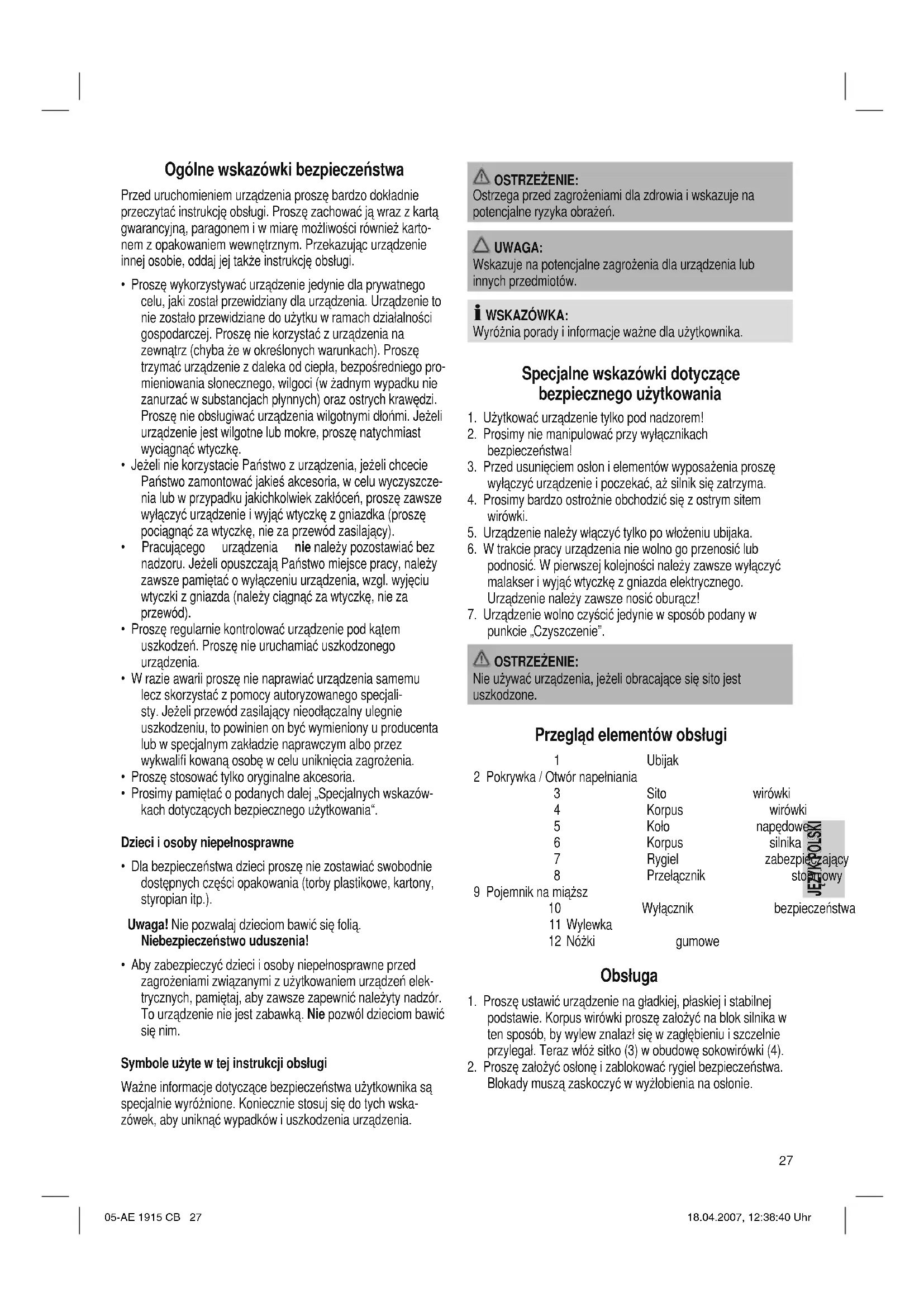 - Urządzenie nie funkcjonuje Środek zaradczy: Proszę sprawdzić podłączenie do sieci. Proszę sprawdzić pozycję włącznika. Inne możliwe przyczyny: Urządzenie zaopatrzone jest w wyłącznik bezpieczeństwa (10). Uniemożliwia on niezamierzone uruchomienie silnika. Środek zaradczy: Proszę sprawdzić poprawne położenie elementów konstruk- cji: sita wirówki i osłony. Dane techniczne Model:......................................................................... AE 1915 CB Napięcie zasilające: ......................................220-240 V, 50/60 Hz Pobór mocy: .................................................................500-700 W Stopień ochrony: ......................................................................... ΙΙ Krótki czas pracy:.................................................................3 min. Niniejsze urządzenie odpowiada wymaganiom normy bezpieczeństwa użytkowania oraz spełnia wymagania dyrekty- wy niskonapięciowej i kompatybilności elektromagnetycznej. Zastrzega się prawo do zmian technicznych! 05-AE 1915 CB 28 18.04.2007, 12:38:41 UhrJĘZYK POLSKI