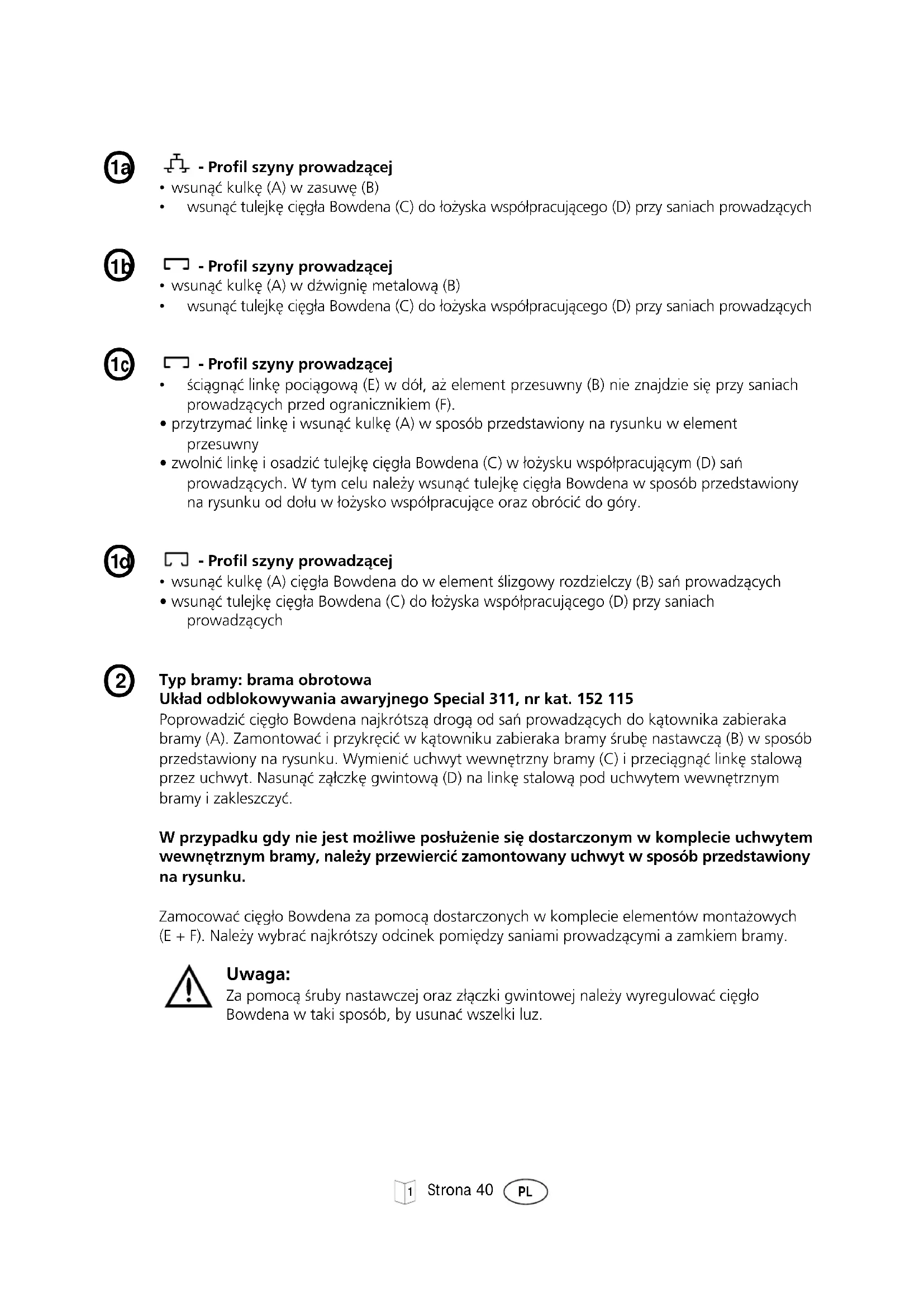 - wsunàç tulejk´ ci´g∏a Bowdena (C) do ∏o˝yska wspó∏pracujàcego (D) przy saniach prowadzàcych Typ bramy: brama obrotowa Uk∏ad odblokowywania awaryjnego Special 311, nr kat. 152 115 Poprowadziç ci´g∏o Bowdena najkrótszà drogà od saƒ prowadzàcych do kàtownika zabieraka bramy (A). Zamontowaç i przykr´ciç w kàtowniku zabieraka bramy Êrub´ nastawczà (B) w sposób przedstawiony na rysunku. Wymieniç uchwyt wewn´trzny bramy (C) i przeciàgnàç link´ stalowà przez uchwyt. Nasunàç zà∏czk´ gwintowà (D) na link´ stalowà pod uchwytem wewn´trznym bramy i zakleszczyç. W przypadku gdy nie jest mo˝liwe pos∏u˝enie si´ dostarczonym w komplecie uchwytem wewn´trznym bramy, nale˝y przewierciç zamontowany uchwyt w sposób przedstawiony na rysunku. Zamocowaç ci´g∏o Bowdena za pomocà dostarczonych w komplecie elementów monta˝owych (E + F). Nale˝y wybraç najkrótszy odcinek pomi´dzy saniami prowadzàcymi a zamkiem bramy. Uwaga: Za pomocà Êruby nastawczej oraz z∏àczki gwintowej nale˝y wyregulowaç ci´g∏o Bowdena w taki sposób, by usunaç wszelki luz.