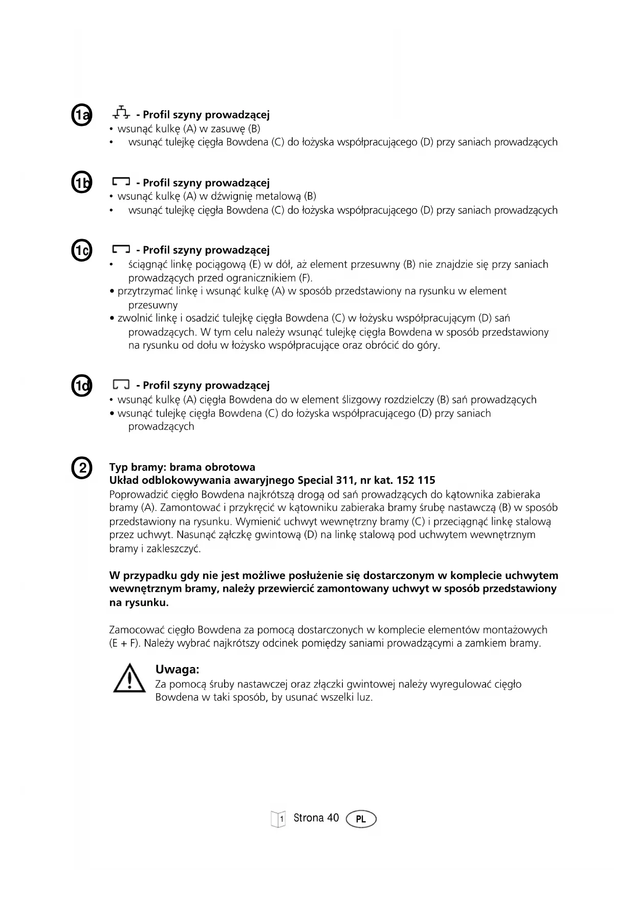 - wsunàç tulejk´ ci´g∏a Bowdena (C) do ∏o˝yska wspó∏pracujàcego (D) przy saniach prowadzàcych Typ bramy: brama obrotowa Uk∏ad odblokowywania awaryjnego Special 311, nr kat. 152 115 Poprowadziç ci´g∏o Bowdena najkrótszà drogà od saƒ prowadzàcych do kàtownika zabieraka bramy (A). Zamontowaç i przykr´ciç w kàtowniku zabieraka bramy Êrub´ nastawczà (B) w sposób przedstawiony na rysunku. Wymieniç uchwyt wewn´trzny bramy (C) i przeciàgnàç link´ stalowà przez uchwyt. Nasunàç zà∏czk´ gwintowà (D) na link´ stalowà pod uchwytem wewn´trznym bramy i zakleszczyç. W przypadku gdy nie jest mo˝liwe pos∏u˝enie si´ dostarczonym w komplecie uchwytem wewn´trznym bramy, nale˝y przewierciç zamontowany uchwyt w sposób przedstawiony na rysunku. Zamocowaç ci´g∏o Bowdena za pomocà dostarczonych w komplecie elementów monta˝owych (E + F). Nale˝y wybraç najkrótszy odcinek pomi´dzy saniami prowadzàcymi a zamkiem bramy. Uwaga: Za pomocà Êruby nastawczej oraz z∏àczki gwintowej nale˝y wyregulowaç ci´g∏o Bowdena w taki sposób, by usunaç wszelki luz.