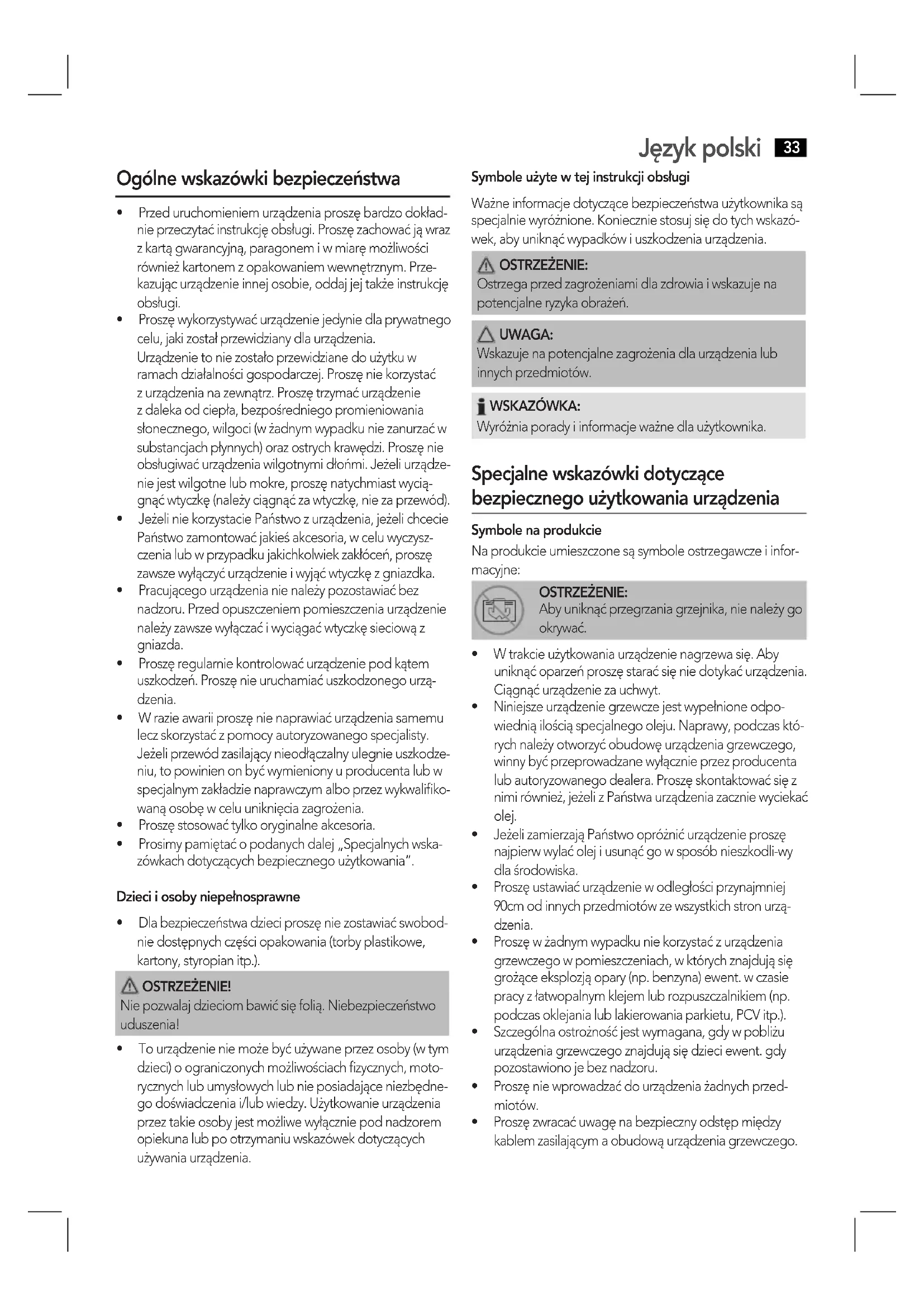 - Tourządzenieniemożebyćużywaneprzezosoby(wtym dzieci) o ograniczonych możliwościach fizycznych, moto- rycznychlubumysłowychlubnieposiadająceniezbędne- go doświadczenia i/lub wiedzy. Użytkowanie urządzenia przez takie osoby jest możliwe wyłącznie pod nadzorem opiekuna lub po otrzymaniu wskazówek dotyczących używania urządzenia. Symbole użyte w tej instrukcji obsługi Ważne informacje dotyczące bezpieczeństwa użytkownika są specjalniewyróżnione.Konieczniestosujsiędotychwskazó- wek, aby uniknąć wypadków i uszkodzenia urządzenia. OSTRZEŻENIE: Ostrzega przed zagrożeniami dla zdrowia i wskazuje na potencjalne ryzyka obrażeń. UWAGA: Wskazuje na potencjalne zagrożenia dla urządzenia lub innych przedmiotów. WSKAZÓWKA: Wyróżnia porady i informacje ważne dla użytkownika. Specjalne wskazówki dotyczące bezpiecznego użytkowania urządzenia Symbole na produkcie Na produkcie umieszczone są symbole ostrzegawcze i infor- macyjne: OSTRZEŻENIE: Aby uniknąć przegrzania grzejnika, nie należy go okrywać.