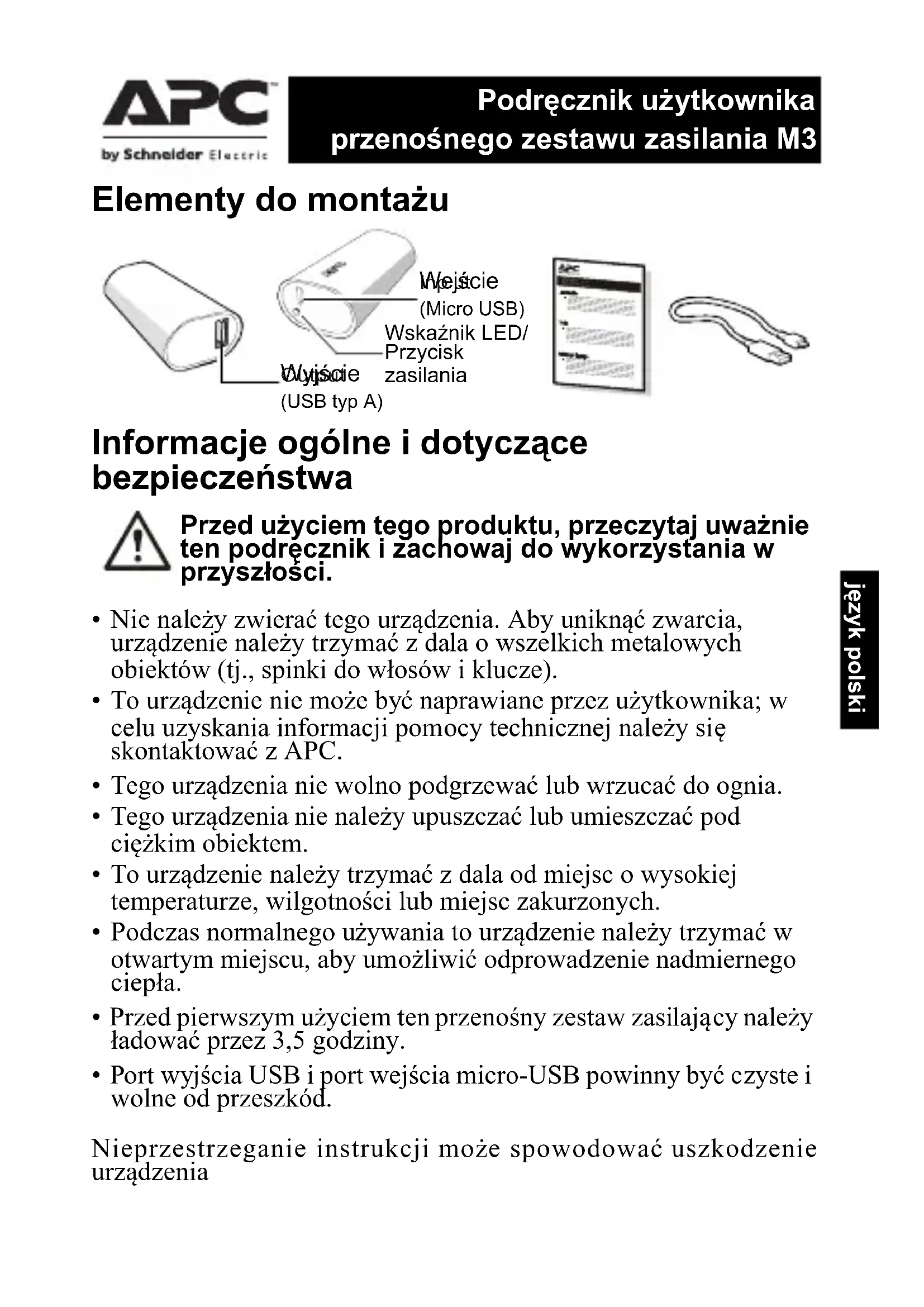 F)© 2015 APC by Schneider Electric. APC i logo APC są własnością firmy Schneider Electric Industries S.A.S. lub jej spółek zależnych. Wszystkie inne znaki towarowe należą do odpowiednich właścicieli. PL 990-5593 01/2015 język polski Rozwiązywanie problemów Pomoc techniczna dla klientów firmy APC by Schneider Electric IT na świecie Informacje dotyczące pomocy technicznej dla poszczególnych krajów są dostępne w witrynie internetowej firmy APC by Schneider Electric pod adresem www.apc.com. Problem/możliwa przyczyna Rozwiązanie Nie można ładować przenośnego zestawu zasilania Ładowarka USB mogła ulec awarii lub komputer znajduje się w trybie uśpienia. Wypróbuj inną ładowarkę USB lub wybudź komputer z trybu uśpienia. Zużyty kabel micro USB i styki złącza. Wypróbuj nowe złącze micro USB. Niektórych urządzeń nie można naładować przenośnym zestawem zasilania. Przenośny zestaw zasilania może nie rozpoznawać i nie wykrywać podłączonych do niego urządzeń. Niektóre kable USB z marketów mogą nie działać prawidłowo z zestawem baterii M3. Aby rozwiązać ten problem, aby rozpocząć ładowanie urządzenia należy nacisn ąć przycisk zasilania na M3. Jeśli zestaw baterii nadal nie będzie ładował urządzenia, należy wymienić kabel z marketu na kabel oryginalny, dostarczony z urządzeniem. Nastąpiło przeciążenie i miga pomarańczowe światło diody LED M3. Podczas ładowania urządzenia przez M3 i przekroczony został określony zakres wartości prądu jego wyjścia. Odłącz ładowane urządzenie od zestaw zasilania M3. Nastąpiło zakończenie użyteczności przenośnego zestawu zasilania lub uległ on awarii. W przypadku awarii systemu, należy się skontaktować z lokalnym dostawcą APC by Schneider Electric lub autoryzowaną agencją serwisową APC by Schneider Electric.Español Inventario Información general y de seguridad Lea este manual de usuario antes de utilizar el producto y guárdelo para futuras consultas.