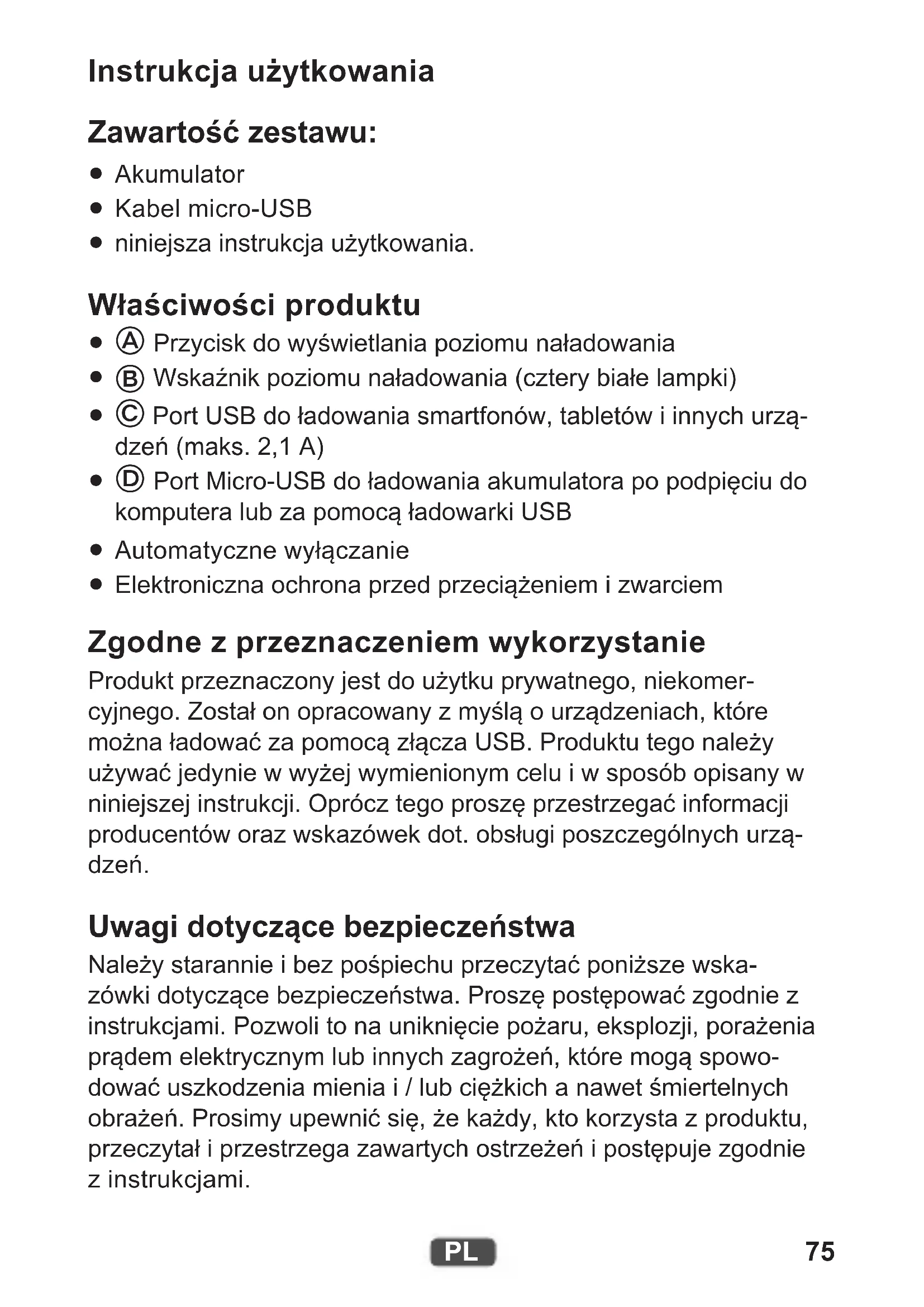 Elektroniczna ochrona przed przeciążeniem i zwarciem Zgodne z przeznaczeniem wykorzystanie Produkt przeznaczony jest do użytku prywatnego, niekomer- cyjnego. Został on opracowany z myślą o urządzeniach, które można ładować za pomocą złącza USB. Produktu tego należy używać jedynie w wyżej wymienionym celu i w sposób opisany w niniejszej instrukcji. Oprócz tego proszę przestrzegać informacji producentów oraz wskazówek dot. obsługi poszczególnych urzą- dzeń. Uwagi dotyczące bezpieczeństwa Należy starannie i bez pośpiechu przeczytać poniższe wska- zówki dotyczące bezpieczeństwa. Proszę postępować zgodnie z instrukcjami. Pozwoli to na uniknięcie pożaru, eksplozji, porażenia prądem elektrycznym lub innych zagrożeń, które mogą spowo- dować uszkodzenia mienia i / lub ciężkich a nawet śmiertelnych obrażeń. Prosimy upewnić się, że każdy, kto korzysta z produktu, przeczytał i przestrzega zawartych ostrzeżeń i postępuje zgodnie z instrukcjami.76