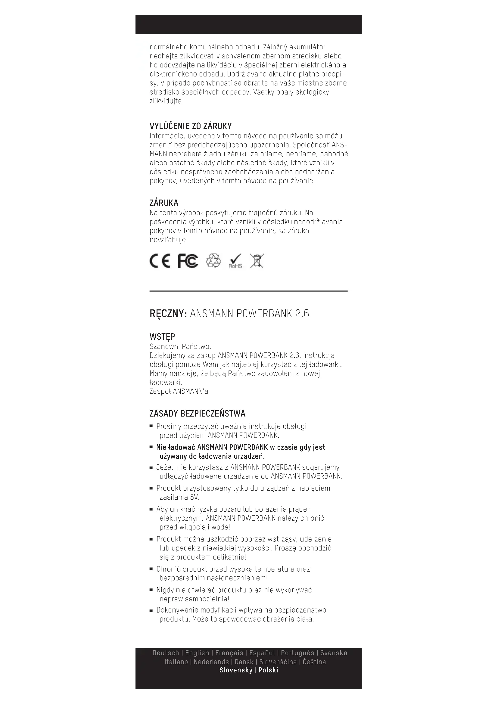 Prosimy przeczytać uważnie instrukcję obsługi przed użyciem ANSMANN POWERBANK. Nie ładować ANSMANN POWERBANK w czasie gdy jest używany do ładowania urządzeń. Jeżeli nie korzystasz z ANSMANN POWERBANK sugerujemy odłączyć ładowane urządzenie od ANSMANN POWERBANK. Produkt przystosowany tylko do urządzeń z napięciem zasilania 5V. Aby uniknąć ryzyka pożaru lub porażenia prądem elektrycznym, ANSMANN POWERBANK należy chronić przed wilgocią i wodą! Produkt można uszkodzić poprzez wstrząsy, uderzenie lub upadek z niewielkiej wysokości. Proszę obchodzić się z produktem delikatnie! Chronić produkt przed wysoką temperaturą oraz bezpośrednim nasłonecznieniem! Nigdy nie otwierać produktu oraz nie wykonywać napraw samodzielnie! Dokonywanie modyfikacji wpływa na bezpieczeństwo produktu. Może to spowodować obrażenia ciała! Deutsch | English | Français | Español | Português | Svenska Italiano | Nederlands | Dansk | Slovenščina | Čeština Slovenský | PolskiUrządzenie nie może być używane przez dzieci lub osoby o ograniczonych zdolnościach fizycznych, czuciowych lub intelektualnych. Ponadto początkujący użytkownicy, którzy nie przeczytali w pełni tej instrukcji powinny być nadzorowani lub przeszkoleni przed przystąpieniem do użytkowania! Nieprzestrzeganie zasad bezpieczeństwa może doprowadzić do uszkodzenia ANSMANN POWERBANK lub podłączonych urządzeń oraz może spowodować zranienie użytkownika! Jeżeli masz jakiekolwiek pytania, skontaktuj się z lokalnym sprzedawcą lub z działem serwisowym.