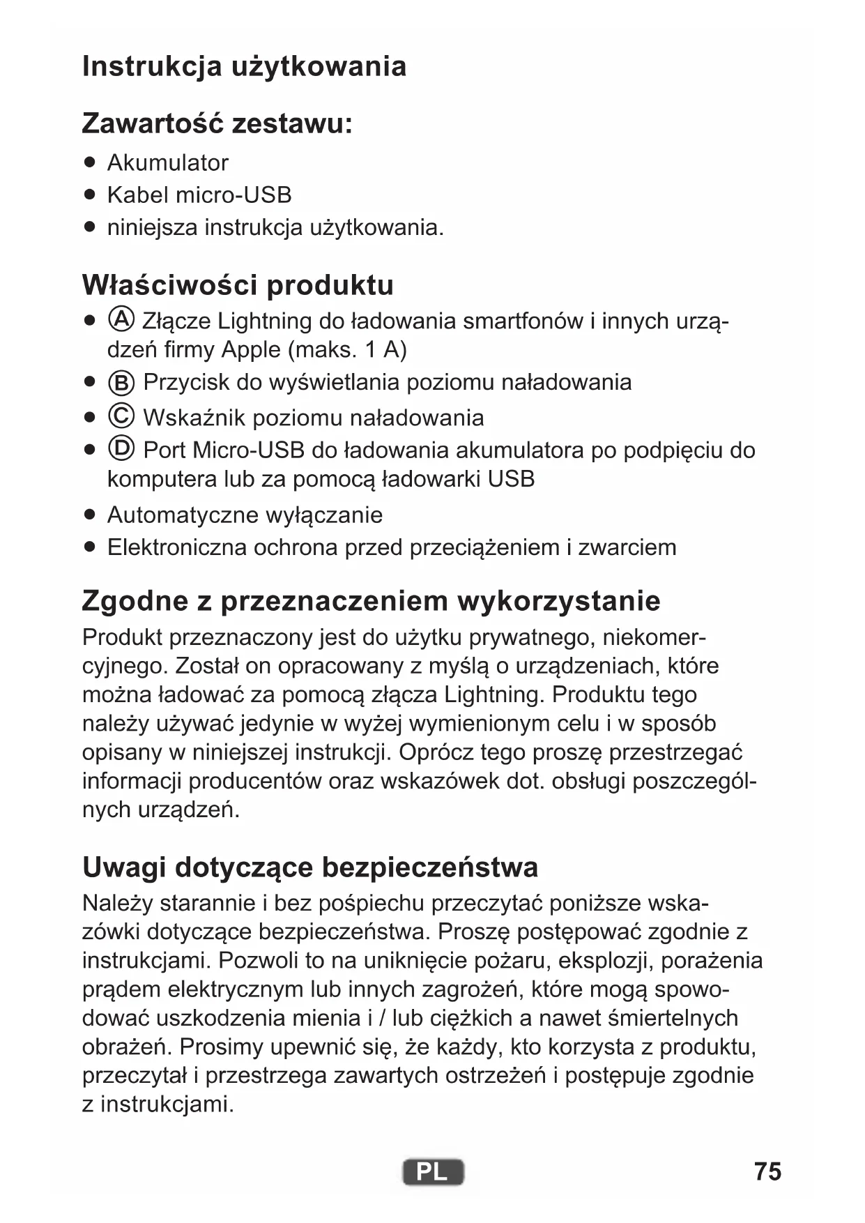 Elektroniczna ochrona przed przeciążeniem i zwarciem Zgodne z przeznaczeniem wykorzystanie Produkt przeznaczony jest do użytku prywatnego, niekomer- cyjnego. Został on opracowany z myślą o urządzeniach, które można ładować za pomocą złącza Lightning. Produktu tego należy używać jedynie w wyżej wymienionym celu i w sposób opisany w niniejszej instrukcji. Oprócz tego proszę przestrzegać informacji producentów oraz wskazówek dot. obsługi poszczegól- nych urządzeń. Uwagi dotyczące bezpieczeństwa Należy starannie i bez pośpiechu przeczytać poniższe wska- zówki dotyczące bezpieczeństwa. Proszę postępować zgodnie z instrukcjami. Pozwoli to na uniknięcie pożaru, eksplozji, porażenia prądem elektrycznym lub innych zagrożeń, które mogą spowo- dować uszkodzenia mienia i / lub ciężkich a nawet śmiertelnych obrażeń. Prosimy upewnić się, że każdy, kto korzysta z produktu, przeczytał i przestrzega zawartych ostrzeżeń i postępuje zgodnie z instrukcjami.76