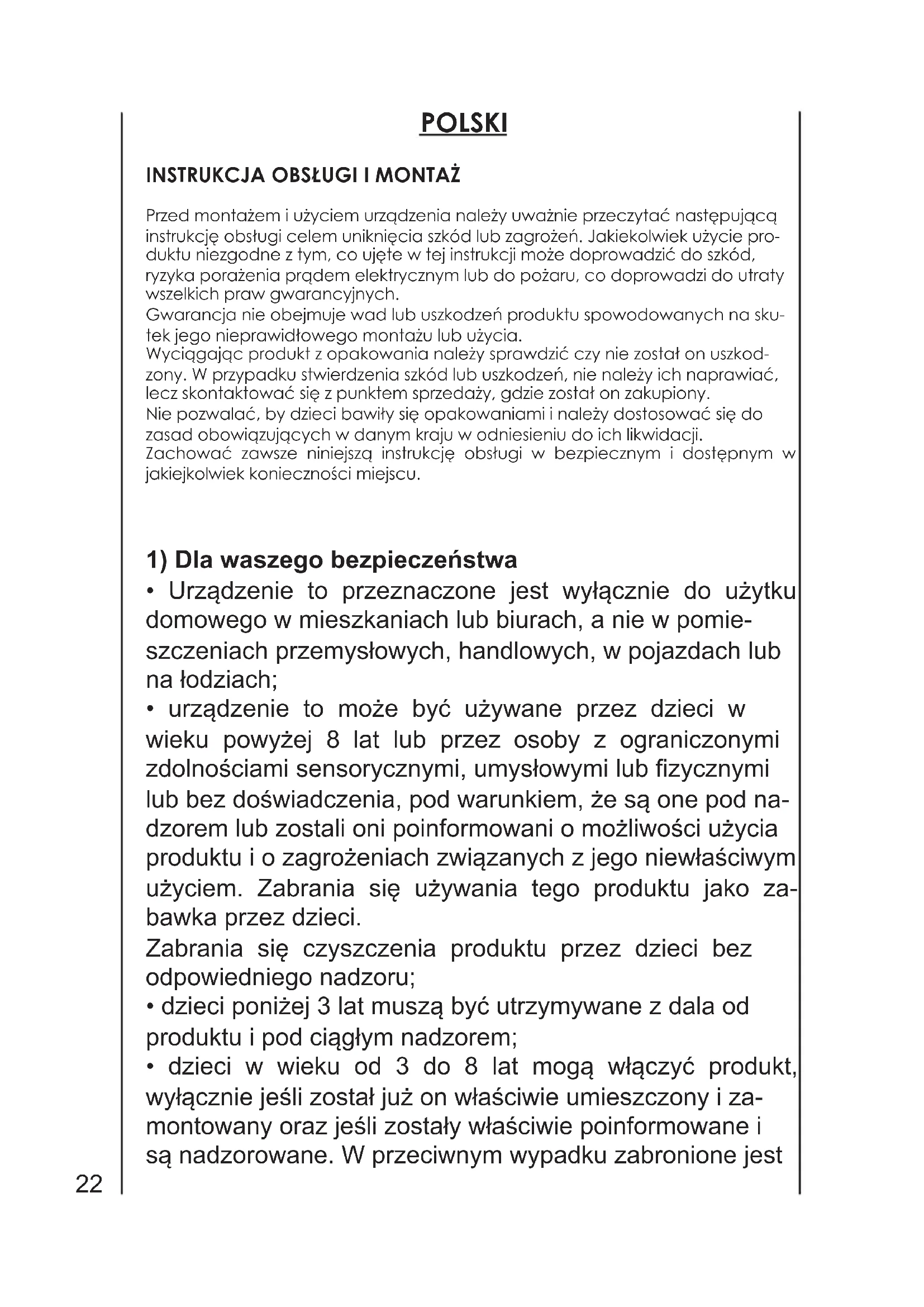 Przed montażem i użyciem urządzenia należy uważnie przeczytać następującą instrukcję obsługi celem uniknięcia szkód lub zagrożeń. Jakiekolwiek użycie pro- duktu niezgodne z tym, co ujęte w tej instrukcji może doprowadzić do szkód, ryzyka porażenia prądem elektrycznym lub do pożaru, co doprowadzi do utraty wszelkich praw gwarancyjnych. Gwarancja nie obejmuje wad lub uszkodzeń produktu spowodowanych na sku- tek jego nieprawidłowego montażu lub użycia. Wyciągając produkt z opakowania należy sprawdzić czy nie został on uszkod- zony. W przypadku stwierdzenia szkód lub uszkodzeń, nie należy ich naprawiać, lecz skontaktować się z punktem sprzedaży, gdzie został on zakupiony. Nie pozwalać, by dzieci bawiły się opakowaniami i należy dostosować się do zasad obowiązujących w danym kraju w odniesieniu do ich likwidacji. Zachować zawsze niniejszą instrukcję obsługi w bezpiecznym i dostępnym w jakiejkolwiek konieczności miejscu.