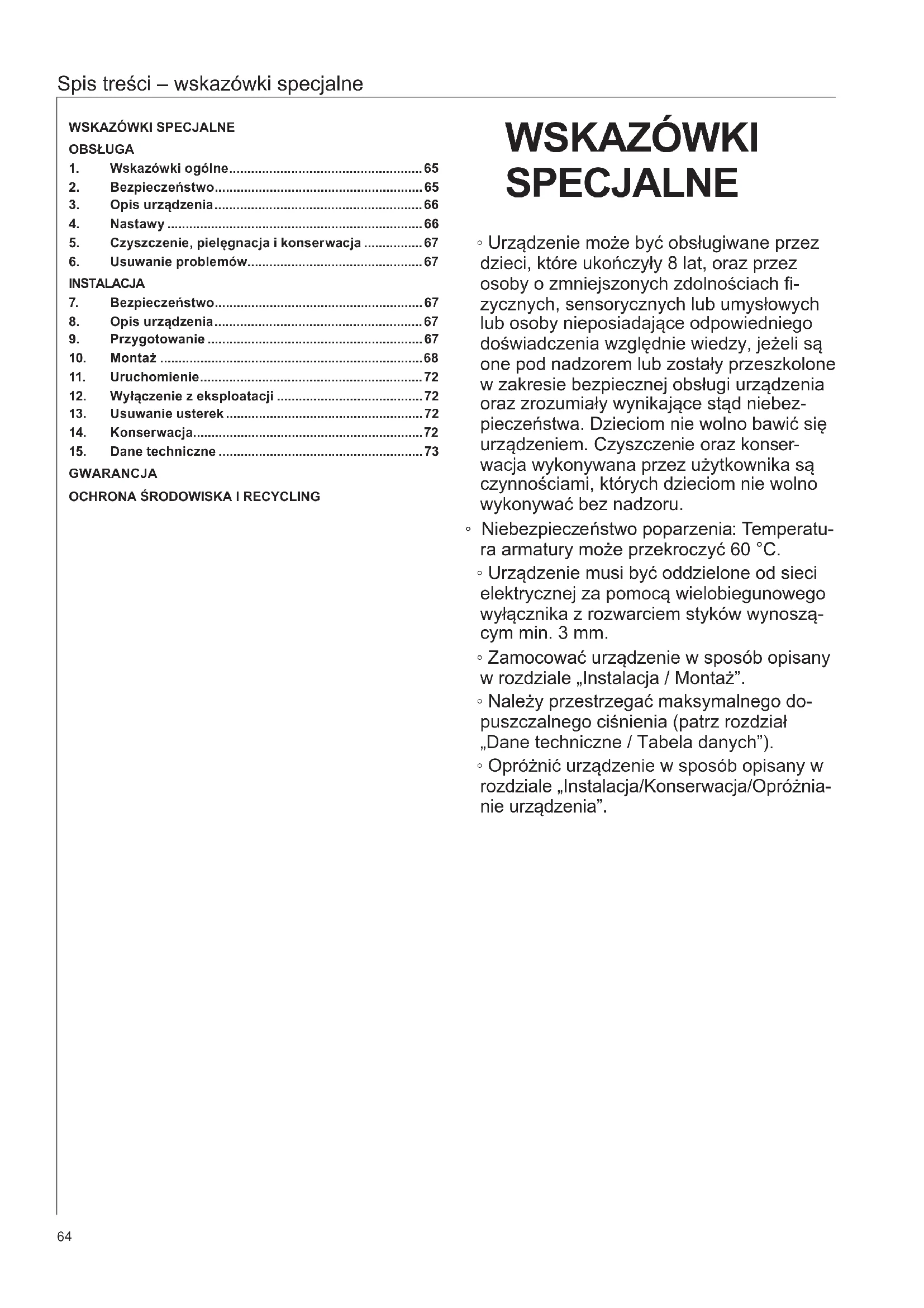 Spis treści – wskazówki specjalne
