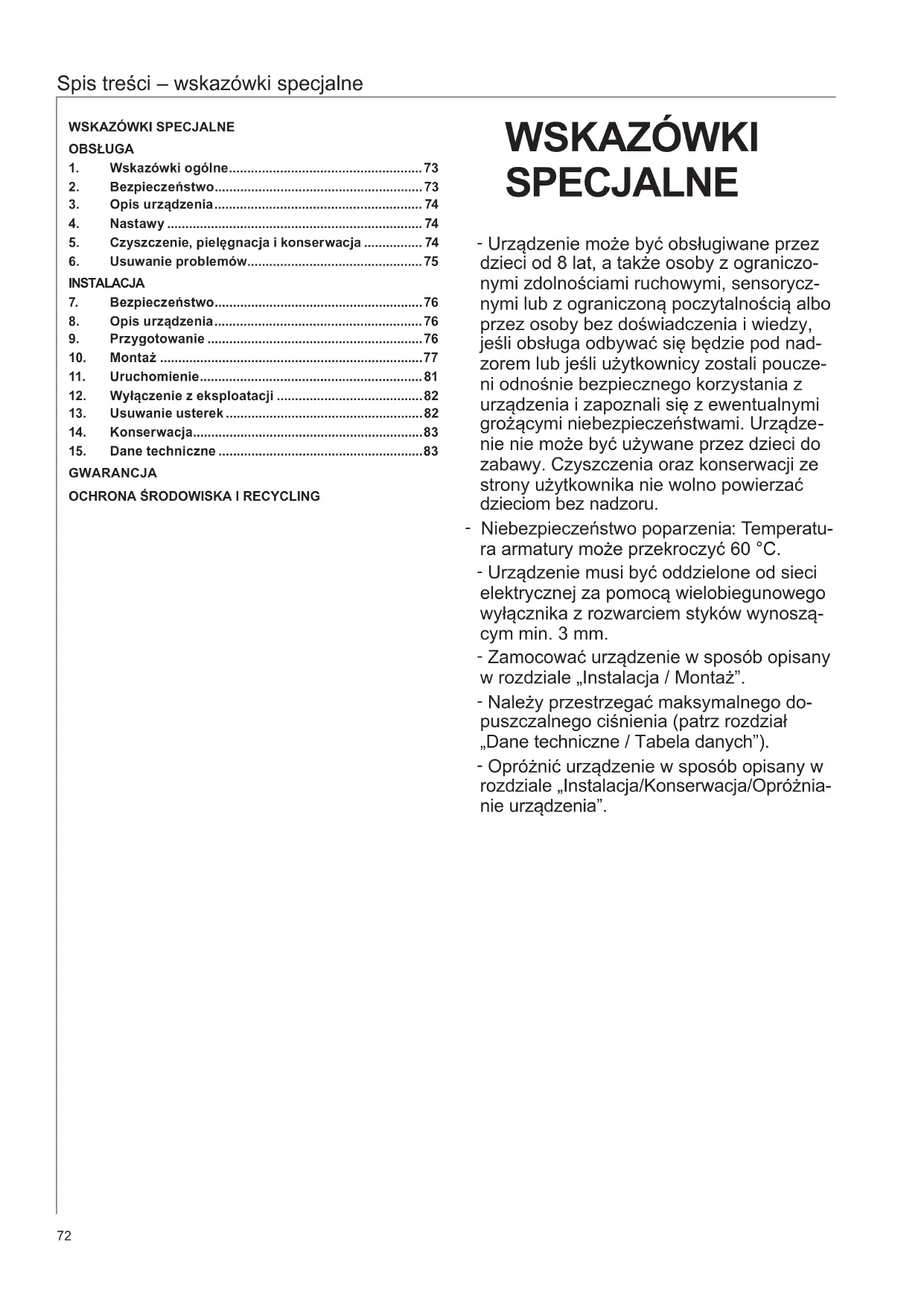 Rozdzielny, Wskazówki spejalne" i,Obstuga" sa przyznaczone dla uzytkowników koncowych urzadzenia i spezialistow.