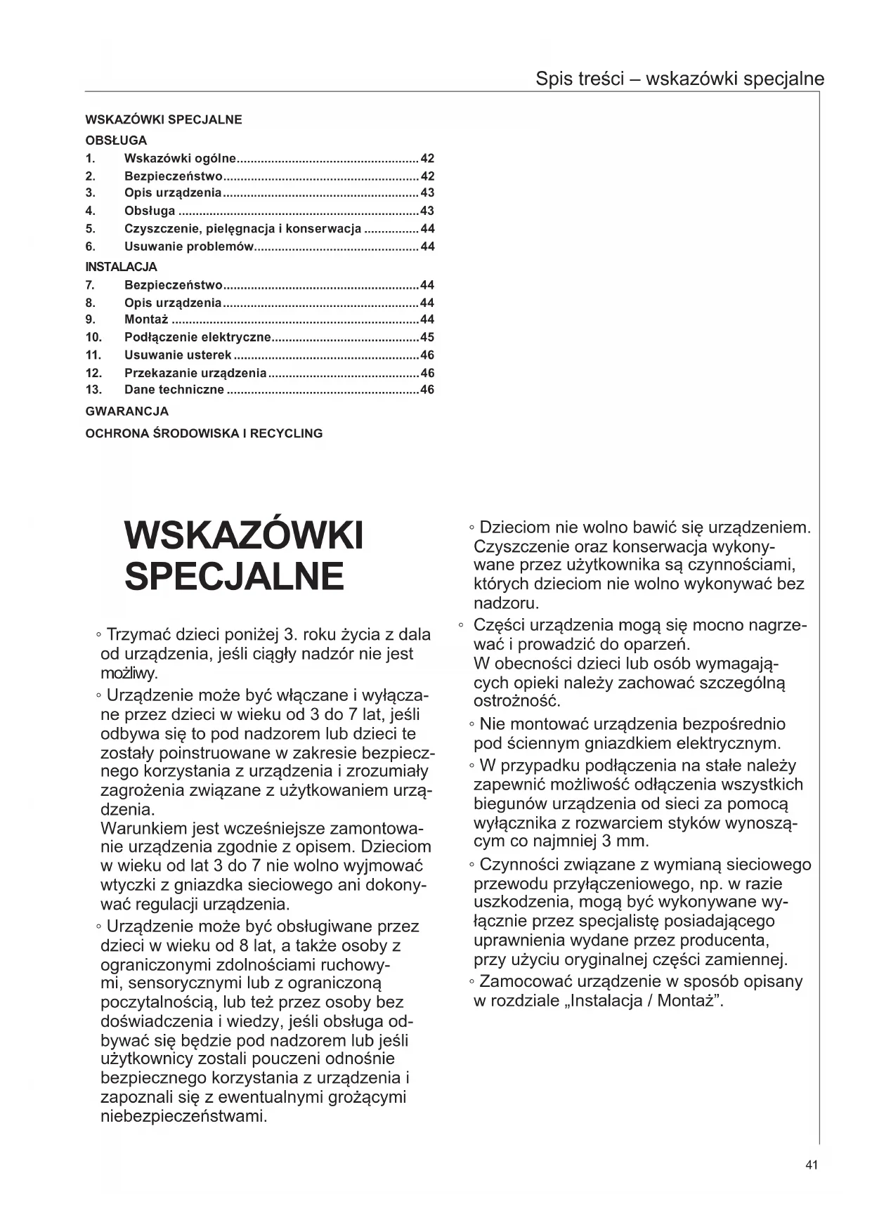 OSTRZEŻENIE obrażenia ciałaTrzymać dzieci poniżej 3. roku życia z dala od urzą-dzenia, jeśli ciągły nadzór nie jest możliwy. Urządzenie może być włączane i wyłączane przez dzi e c i w wieku od 3 do 7 lat , jeśli odby wa si ę to pod nad - zorem lub dzieci te zostały poinstruowane w zakresie bezpiecznego korzystania z urządzenia i zrozumiały zagrożenia związane z użytkowaniem urządzenia. Warunkiem jest wcześniejsze zamontowanie urzą-dzenia zgodnie z opisem. Dzieciom w wieku od lat 3 do 7 nie wolno wyjmować wtyczki z gniazdka siecio- wego ani dokonywać regulacji urządzenia. Urządzenie może być obsługiwane przez dzieci w wieku od 8 lat, a także osoby z ograniczonymi zdol- nościami ruchowymi, sensorycznymi lub z ogra- niczoną poczytalnością, lub też przez osoby bez doświadczenia i wiedzy, jeśli obsługa odbywać się będzie pod nadzorem lub jeśli użytkownicy zosta- li pouczeni odnośnie bezpiecznego korzystania z urządzenia i zapoznali się z ewentualnymi grożącymi niebezpieczeństwami.Dzieciom nie wolno bawić się urządzeniem. Czysz-czenie oraz konserwacja wykonywane przez użyt- kownika są czynnościami, których dzieciom nie wolno wykonywać bez nadzoru. OSTROŻNIE Poparzenie Części urządzenia mogą się mocno nagrzewać i pro- wadzić do oparzeń. W obecności dzieci lub osób wymagających opieki należy zachować szczególną ostrożność. Wskazówka Urządzenie użytkować wyłącznie w stanie całko- wicie zmontowanym i ze wszystkimi urządzeniami zabezpieczającymi.