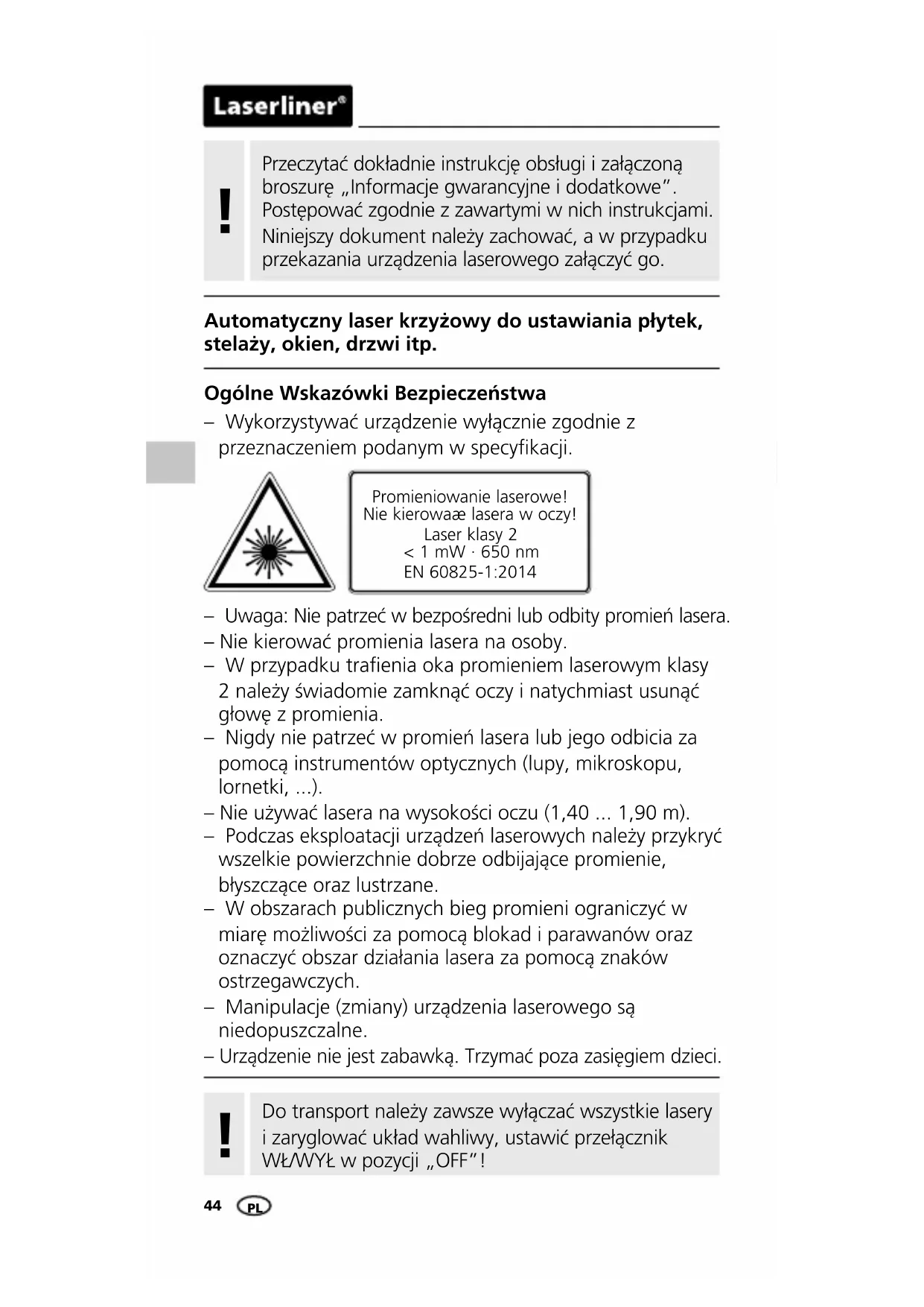 Ogólne Wskazówki Bezpieczeństwa – Uwaga: Nie patrzeć w bezpośredni lub odbity promień lasera. – Nie kierować promienia lasera na osoby. – W przypadku traenia oka promieniem laserowym klasy 2 należy świadomie zamknąć oczy i natychmiast usunąć głowę z promienia. – Nigdy nie patrzeć w promień lasera lub jego odbicia za pomocą instrumentów optycznych (lupy, mikroskopu, lornetki, ...). – Nie używać lasera na wysokości oczu (1,40 ... 1,90 m). – Podczas eksploatacji urządzeń laserowych należy przykryć wszelkie powierzchnie dobrze odbijające promienie, błyszczące oraz lustrzane. – W obszarach publicznych bieg promieni ograniczyć w miarę możliwości za pomocą blokad i parawanów oraz oznaczyć obszar działania lasera za pomocą znaków ostrzegawczych. – Manipulacje (zmiany) urządzenia laserowego są niedopuszczalne. – Urządzenie nie jest zabawką. Trzymać poza zasięgiem dzieci. – Wykorzystywać urządzenie wyłącznie zgodnie z przeznaczeniem podanym w specykacji. Promieniowanie laserowe! Nie kierowaæ lasera w oczy! Laser klasy 2 < 1 mW · 650 nm EN 60825-1:2014 Automatyczny laser krzyżowy do ustawiania płytek, stelaży, okien, drzwi itp. Do transport należy zawsze wyłączać wszystkie lasery i zaryglować układ wahliwy, ustawić przełącznik WŁ/WYŁ w pozycji „OFF”! !SmartCross-Laser