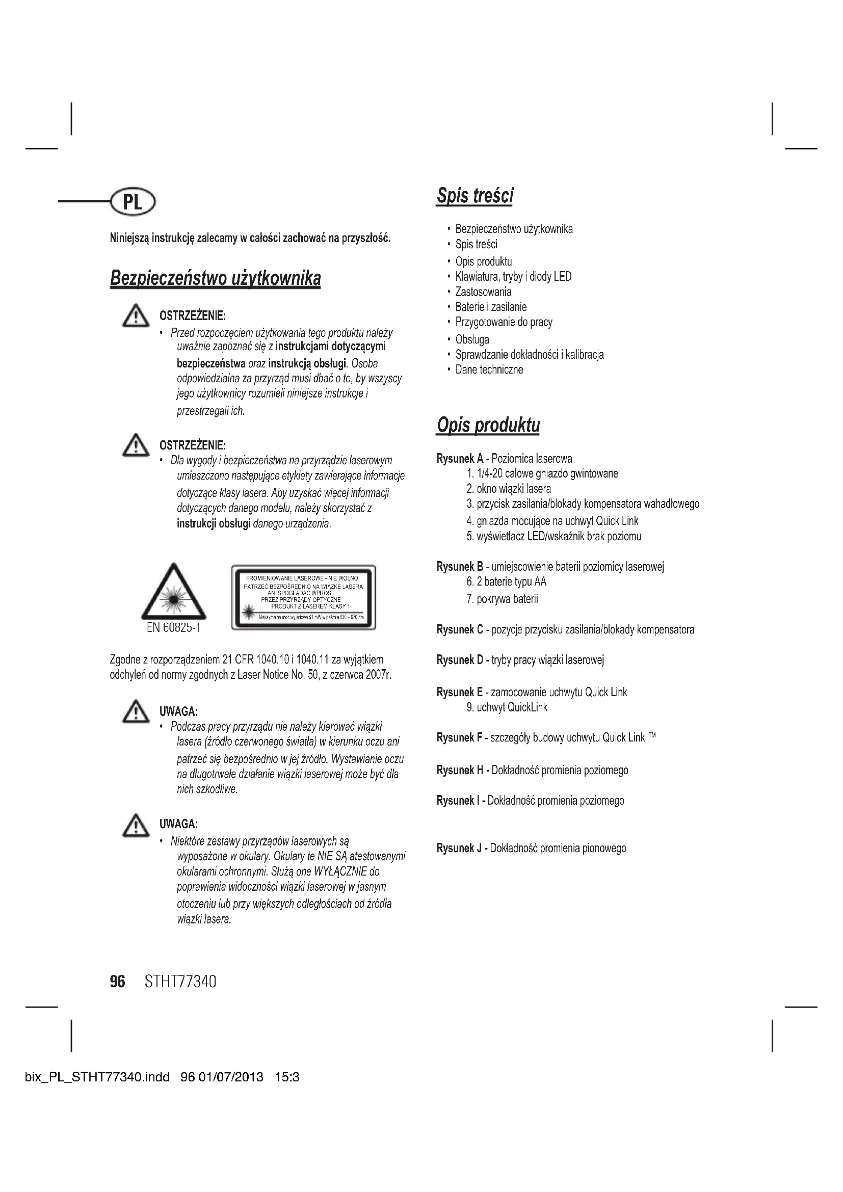 - 0,5mm≤1,6mm (PRAWDA, urządzenie zachowuje kalibrację) Cubix_PL_STHT77340.indd 101 01/07/2013 15:36102 STHT77340 Dane techniczne Urządzenie laserowe Cubix (STHT77340) Dokładność w poziomie: ≤8 mm / 10m (5/16in / 30ft) Dokładność promienia poziomego / pionowego ≤8 mm / 10m (5/16in / 30ft) Zakres kompensacji: : ± 4° Odległość robocza (Linia): 12 m (40ft) Klasa lasera: Klasa 1 (EN60825-1) Pasmo wiązki laserowej: 630 nm ~ 670 nm Czas pracy: ≥12 godzin (baterie alkaliczne) Źródło zasilania: 2 x “AA” (LR6) Klasa IP: IP50 Zakres temperatur roboczych: -10° C ~ +40° C (14ºF ~ 104ºF) Zakres temperatur przechowywania: -25° C ~ +70° C (13ºF ~ 158ºF) Cubix_PL_STHT77340.indd 102 01/07/2013 15:36STHT773340