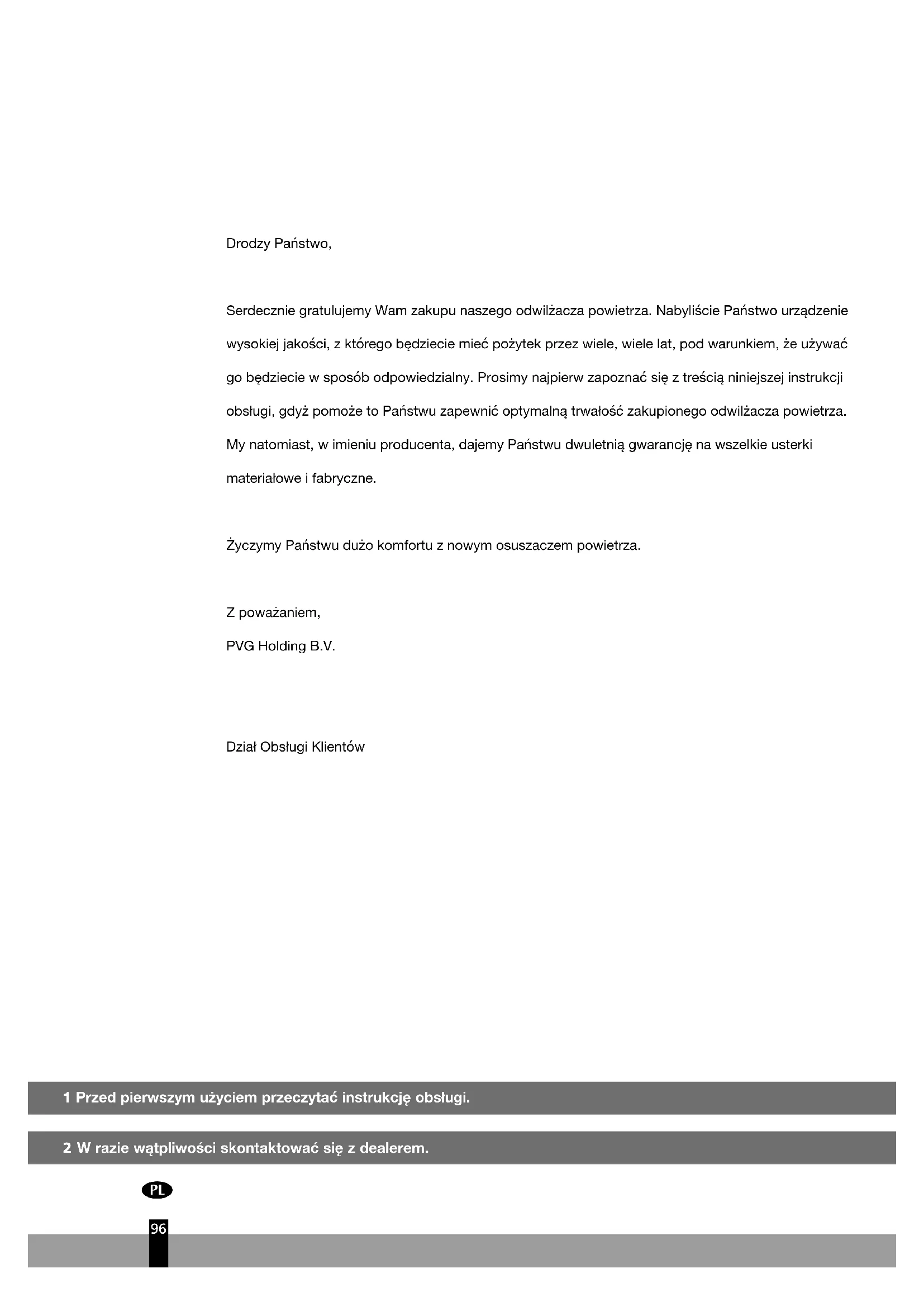 Drodzy Państwo, Serdecznie gratulujemy Wam zakupu naszego odwilżacza powietrza. Nabyliście Państwo urządzenie wysokiej jakości, z którego będziecie mieć pożytek przez wiele, wiele lat, pod warunkiem, że używać go będziecie w sposób odpowiedzialny. Prosimy najpierw zapoznać się z treścią niniejszej instrukcji obsługi, gdyż pomoże to Państwu zapewnić optymalną trwałość zakupionego odwilżacza powietrza. My natomiast, w imieniu producenta, dajemy Państwu dwuletnią gwarancję na wszelkie usterki materiałowe i fabryczne. Życzymy Państwu dużo komfortu z nowym osuszaczem powietrza. Z poważaniem, PVG Holding B.V. Dział Obsługi KlientówIdentyfikacja części Panel sterowania Regulator/ higrostat Otwór wylotowy suchego powietrza Ruchomy zbiornik wody Otwór wlotowy wilgotnego powietrza Filtr powietrza Rurka odpływowa (ø13 mm) z zaślepką Przewód z wtyczką sieciową Uchwyt