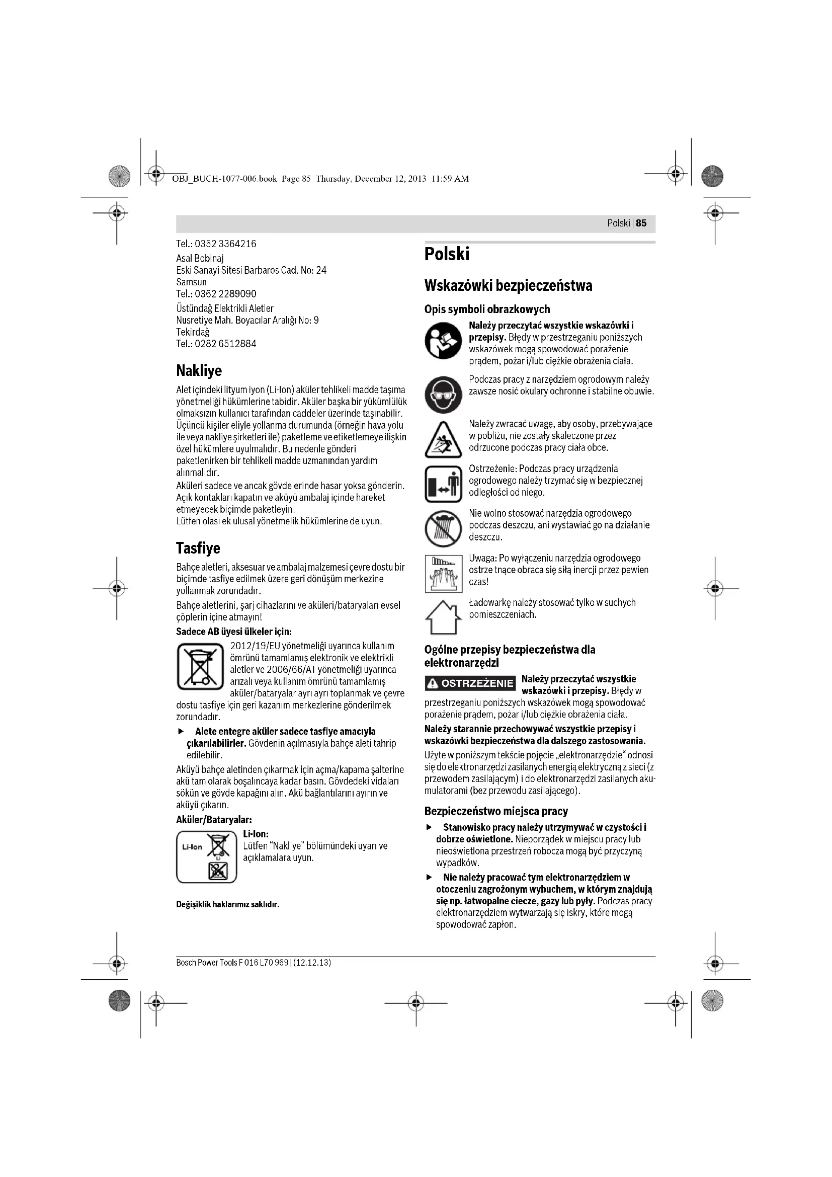 Denizli Tel.: 0258 2620666 Bulut Elektrik İstasyon Cad. No: 52/B Devlet Tiyatrosu Karşısı Elazığ Tel.: 0424 2183559 Körfez Elektrik Sanayi Çarşısı 770 Sok. No: 71 Erzincan Tel.: 0446 2230959 Ege Elektrik İnönü Bulvaro No: 135 Muğla Makasarası Fethiye Fethiye Tel.: 0252 6145701 Değer İş Bobinaj İsmetpaşa Mah. İlk Belediye Başkan Cad. 5/C Şahinbey Gaziantep Tel.: 0342 2316432 Çözüm Bobinaj İsmetpaşa Mah. Eski Şahinbey Belediyesi altı Cad. No: 3/C Gaziantep Tel.: 0342 2319500 Onarım Bobinaj Raifpaşa Cad. No: 67 İskenderun Hatay Tel.: 0326 6137546 Günşah Otomotiv Beylikdüzü Sanayi Sit. No: 210 Beylikdüzü İstanbul Tel.: 0212 8720066 Aygem 10021 Sok. No: 11 AOSB Çiğli İzmir Tel.: 0232 3768074 Sezmen Bobinaj Ege İş Merkezi 1201/4 Sok. No: 4/B Yenişehir İzmir Tel.: 0232 4571465 Ankaralı Elektrik Eski Sanayi Bölgesi 3. Cad. No: 43 Kayseri Hata göstergesi Olası neden Giderilme yolu Bir şarj periyoduna düşün kesme süresi çok kısa Akü kullanım ömrünün sonuna yaklaşıyor Müşteri servisine başvurun Akü şarj göstergesi sürekli yanıyor Şarj işlemi mümkün değil Akü arızalı Müşteri servisine başvurun OBJ_BUCH-1077-006.book Page 84 Thursday, December 12, 2013 11:59 AMPolski | 85 Bosch Power Tools F 016 L70 969 | (12.12.13) Tel.: 0352 3364216 Asal Bobinaj Eski Sanayi Sitesi Barbaros Cad. No: 24 Samsun Tel.: 0362 2289090 Üstündağ Elektrikli Aletler Nusretiye Mah. Boyacılar Aralığı No: 9 Tekirdağ Tel.: 0282 6512884 Nakliye Alet içindeki lityum iyon (Li-Ion) aküler tehlikeli madde taşıma yönetmeliği hükümlerine tabidir. Aküler başka bir yükümlülük olmaksızın kullanıcı tarafından caddeler üzerinde taşınabilir. Üçüncü kişiler eliyle yollanma durumunda (örneğin hava yolu ile veya nakliye şirketleri ile) paketleme ve etiketlemeye ilişkin özel hükümlere uyulmalıdır. Bu nedenle gönderi paketlenirken bir tehlikeli madde uzmanından yardım alınmalıdır. Aküleri sadece ve ancak gövdelerinde hasar yoksa gönderin. Açık kontakları kapatın ve aküyü ambalaj içinde hareket etmeyecek biçimde paketleyin. Lütfen olası ek ulusal yönetmelik hükümlerine de uyun. Tasfiye Bahçe aletleri, aksesuar ve ambalaj malzemesi çevre dostu bir biçimde tasfiye edilmek üzere geri dönüşüm merkezine yollanmak zorundadır. Bahçe aletlerini, şarj cihazlarını ve aküleri/bataryaları evsel çöplerin içine atmayın! Sadece AB üyesi ülkeler için: 2012/19/EU yönetmeliği uyarınca kullanım ömrünü tamamlamış elektronik ve elektrikli aletler ve 2006/66/AT yönetmeliği uyarınca arızalı veya kullanım ömrünü tamamlamış aküler/bataryalar ayrı ayrı toplanmak ve çevre dostu tasfiye için geri kazanım merkezlerine gönderilmek zorundadır. Alete entegre aküler sadece tasfiye amacıyla çıkarılabilirler. Gövdenin açılmasıyla bahçe aleti tahrip edilebilir. Aküyü bahçe aletinden çıkarmak için açma/kapama şalterine akü tam olarak boşalıncaya kadar basın. Gövdedeki vidaları sökün ve gövde kapağını alın. Akü bağlantılarını ayırın ve aküyü çıkarın. Aküler/Bataryalar: Li-Ion: Lütfen “Nakliye” bölümündeki uyarı ve açıklamalara uyun. Değişiklik haklarımız saklıdır. Polski Wskazówki bezpieczeństwa Opis symboli obrazkowych Należy przeczytać wszystkie wskazówki i przepisy. Błędy w przestrzeganiu poniższych wskazówek mogą spowodować porażenie prądem, pożar i/lub ciężkie obrażenia ciała. Podczas pracy z narzędziem ogrodowym należy zawsze nosić okulary ochronne i stabilne obuwie. Należy zwracać uwagę, aby osoby, przebywające w pobliżu, nie zostały skaleczone przez odrzucone podczas pracy ciała obce. Ostrzeżenie: Podczas pracy urządzenia ogrodowego należy trzymać się w bezpiecznej odległości od niego. Nie wolno stosować narzędzia ogrodowego podczas deszczu, ani wystawiać go na działanie deszczu. Uwaga: Po wyłączeniu narzędzia ogrodowego ostrze tnące obraca się siłą inercji przez pewien czas! Ładowarkę należy stosować tylko w suchych pomieszczeniach. Ogólne przepisy bezpieczeństwa dla elektronarzędzi Należy przeczytać wszystkie wskazówki i przepisy. Błędy w przestrzeganiu poniższych wskazówek mogą spowodować porażenie prądem, pożar i/lub ciężkie obrażenia ciała. Należy starannie przechowywać wszystkie przepisy i wskazówki bezpieczeństwa dla dalszego zastosowania. Użyte w poniższym tekście pojęcie „elektronarzędzie“ odnosi się do elektronarzędzi zasilanych energią elektryczną z sieci (z przewodem zasilającym) i do elektronarzędzi zasilanych aku- mulatorami (bez przewodu zasilającego). Bezpieczeństwo miejsca pracy Stanowisko pracy należy utrzymywać w czystości i dobrze oświetlone. Nieporządek w miejscu pracy lub nieoświetlona przestrzeń robocza mogą być przyczyną wypadków. Nie należy pracować tym elektronarzędziem w otoczeniu zagrożonym wybuchem, w którym znajdują się np. łatwopalne ciecze, gazy lub pyły. Podczas pracy elektronarzędziem wytwarzają się iskry, które mogą spowodować zapłon. OSTRZEZENIE OBJ_BUCH-1077-006.book Page 85 Thursday, December 12, 2013 11:59 AM86 | Polski F 016 L70 969 | (12.12.13) Bosch Power Tools Podczas użytkowania urządzenia zwrócić uwagę na to, aby dzieci i inne osoby postronne znajdowały się w bez- piecznej odległości. Odwrócenie uwagi może spowodować utratę kontroli nad narzędziem. Bezpieczeństwo elektryczne Wtyczka elektronarzędzia musi pasować do gniazda. Nie wolno zmieniać wtyczki w jakikolwiek sposób. Nie wolno używać wtyków adapterowych w przypadku elektronarzędzi z uziemieniem ochronnym. Niezmienione wtyczki i pasujące gniazda zmniejszają ryzyko porażenia prądem. Należy unikać kontaktu z uziemionymi powierzchniami jak rury, grzejniki, piece i lodówki. Ryzyko porażenia prądem jest większe, gdy ciało użytkownika jest uziemio- ne. Urządzenie należy zabezpie