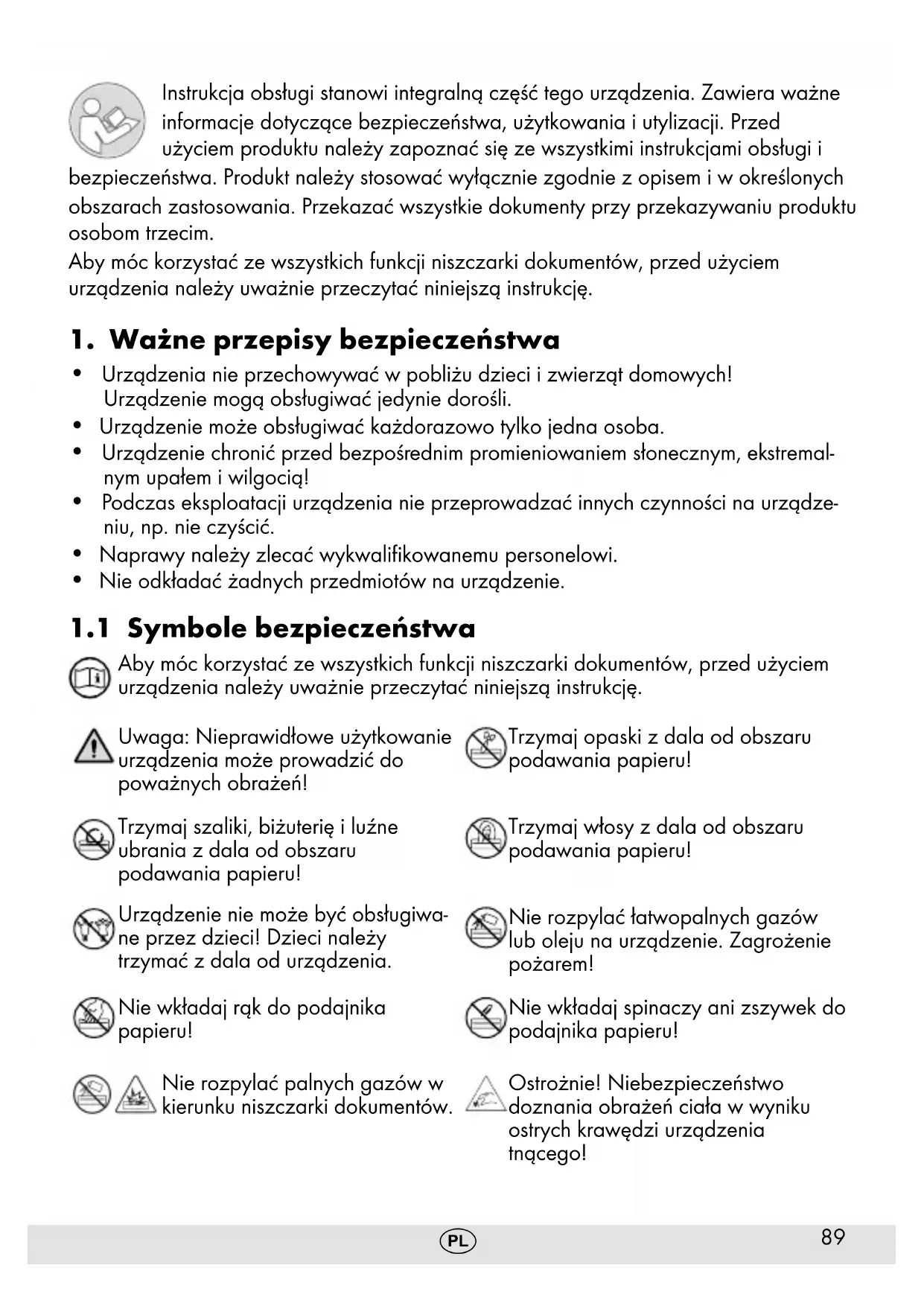 Aby móc korzystać ze wszystkich funkcji niszczarki dokumentów, przed użyciem urządzenia należy uważnie przeczytać niniejszą instrukcję. Uwaga: Nieprawidłowe użytkowanie urządzenia może prowadzić do poważnych obrażeń! Trzymaj opaski z dala od obszaru podawania papieru! Trzymaj szaliki, biżuterię i luźne ubrania z dala od obszaru podawania papieru! Trzymaj włosy z dala od obszaru podawania papieru! Urządzenie nie może być obsługiwa- ne przez dzieci! Dzieci należy trzymać z dala od urządzenia. Nie rozpylać łatwopalnych gazów lub oleju na urządzenie. Zagrożenie pożarem! Nie wkładaj rąk do podajnika papieru! Nie wkładaj spinaczy ani zszywek do podajnika papieru! Nie rozpylać palnych gazów w kierunku niszczarki dokumentów. Ostrożnie! Niebezpieczeństwo doznania obrażeń ciała w wyniku ostrych krawędzi urządzenia tnącego!90