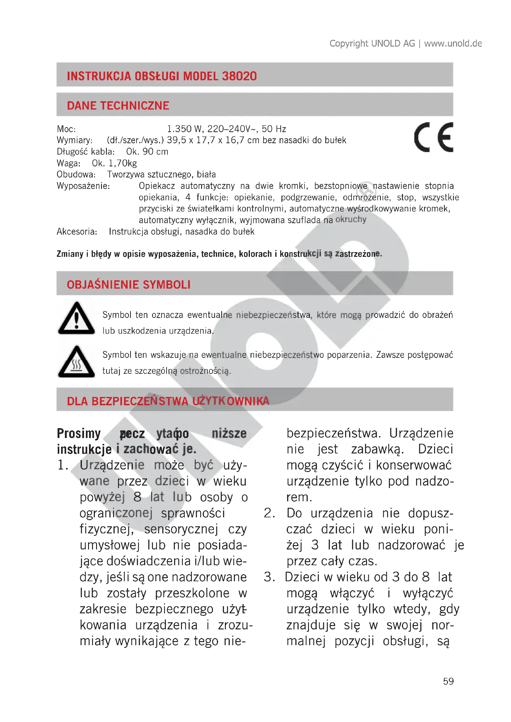waną osobę zostać zastą- piony w celu uniknięcia zagrożenia. Copyright UNOLD AG | www.unold.de62 OSTROŻNIE: Urządzenie podczas pracy jest bardzo gorące! W żadnym wypadku nie otwierać obudowy urządzenia. Nie wkładać narzędzi, sztućców ani części ciała do szpara dla chleb. Istnieje niebezpieczeństwo porażenia prądem. Producent nie przejmuje odpowiedzialności za nieodpowiednie bądź wadliwe użytkowanie lub po przeprowadzonych naprawach przez nieautoryzowane zakłady bądź niekompetentne osoby.