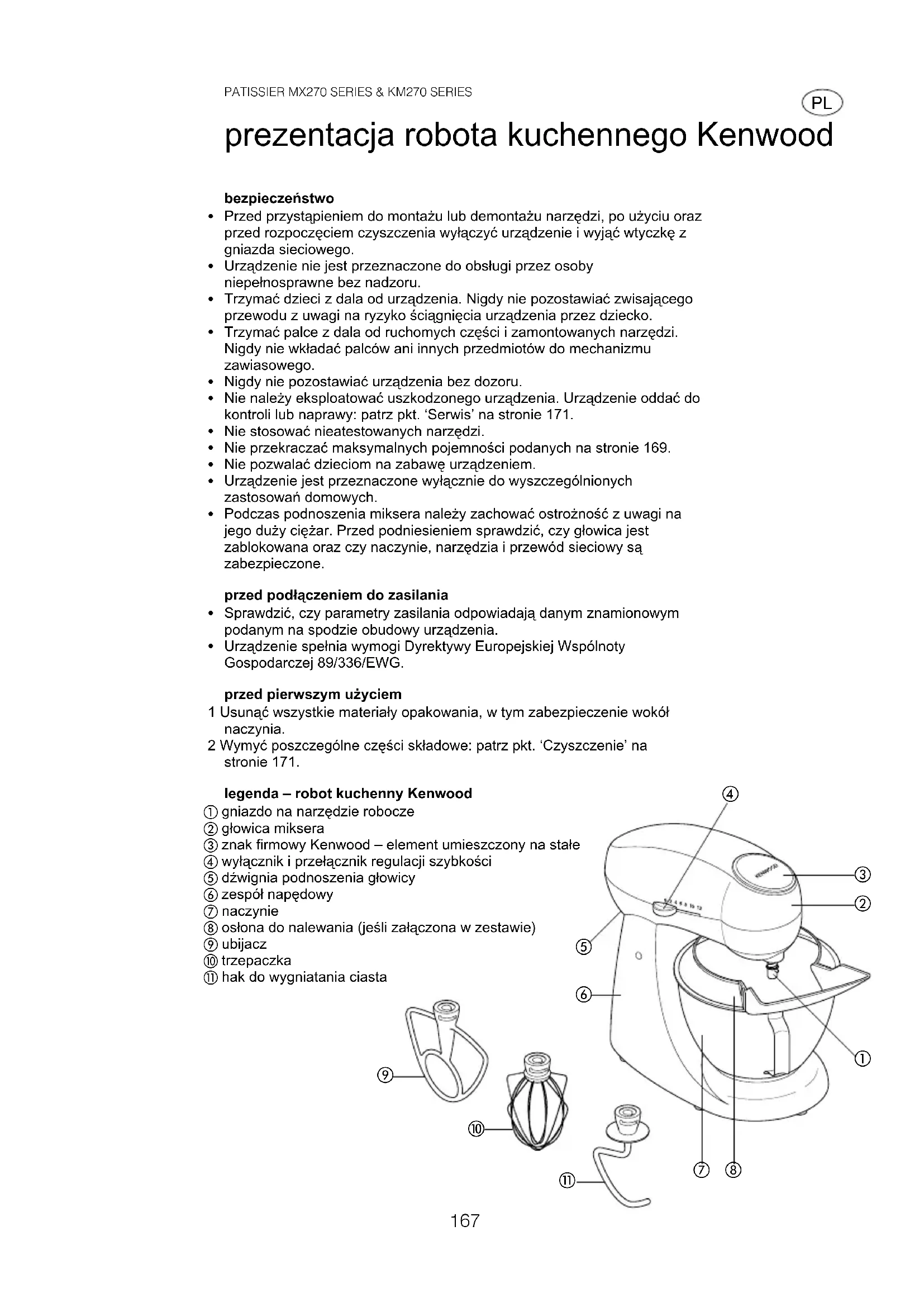 Urządzenie spełnia wymogi Dyrektywy Europejskiej Wspólnoty Gospodarczej 89/336/EWG. przed pierwszym użyciem 1 Usunąć wszystkie materiały opakowania, w tym zabezpieczenie wokół naczynia. 2 Wymyć poszczególne części składowe: patrz pkt. ‘Czyszczenie’ na stronie 171. legenda – robot kuchenny Kenwood gniazdo na narzędzie robocze głowica miksera znak firmowy Kenwood – element umieszczony na stałe wyłącznik i przełącznik regulacji szybkości dźwignia podnoszenia głowicy zespół napędowy naczynie osłona do nalewania (jeśli załączona w zestawie) ubijacz trzepaczka hak do wygniatania ciasta