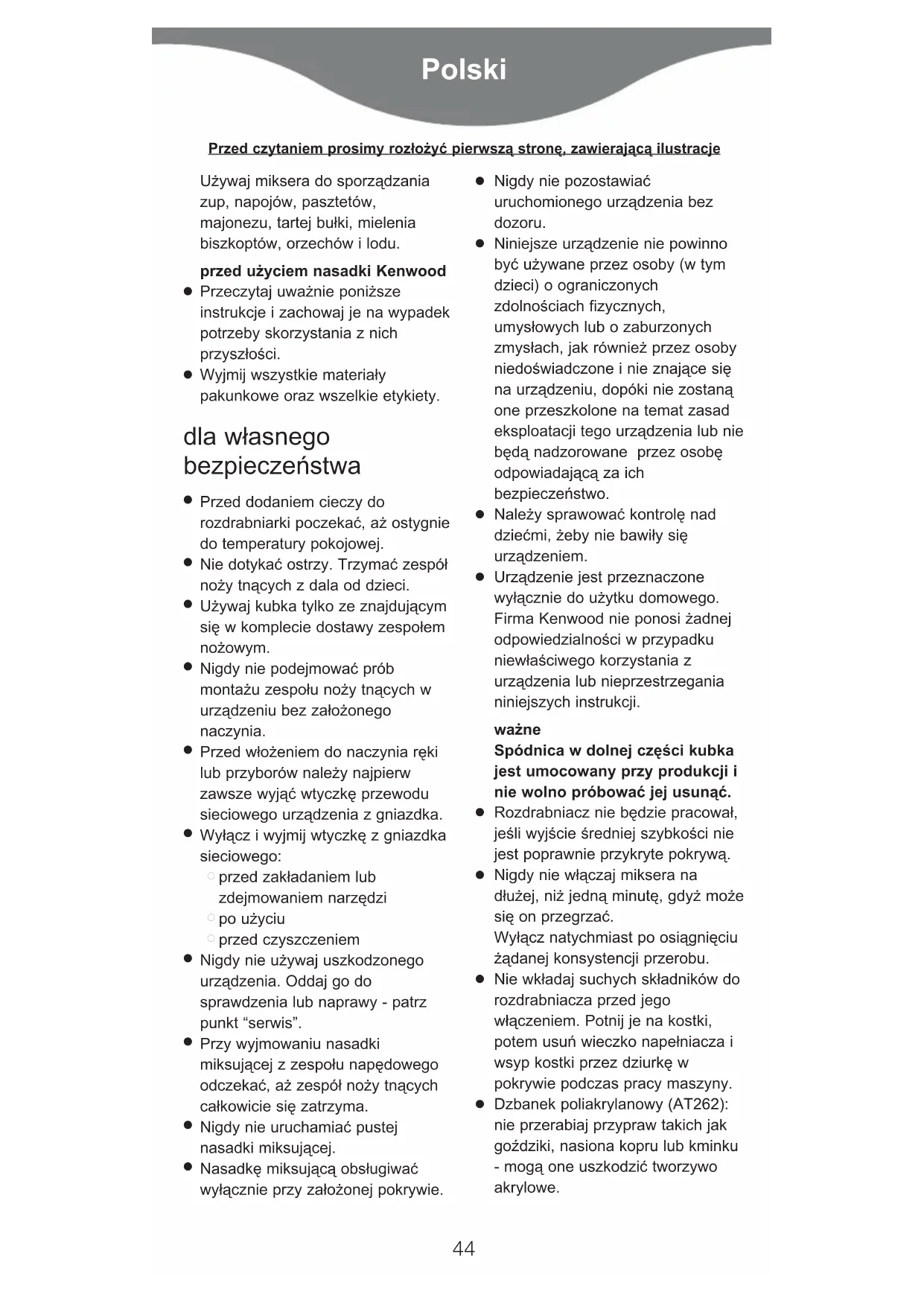 Urządzenie jest przeznaczone wyłącznie do użytku domowego. Firma Kenwood nie ponosi żadnej odpowiedzialności w przypadku niewłaściwego korzystania z urządzenia lub nieprzestrzegania niniejszych instrukcji. ważne Spódnica w dolnej części kubka jest umocowany przy produkcji i nie wolno próbować jej usunąć.