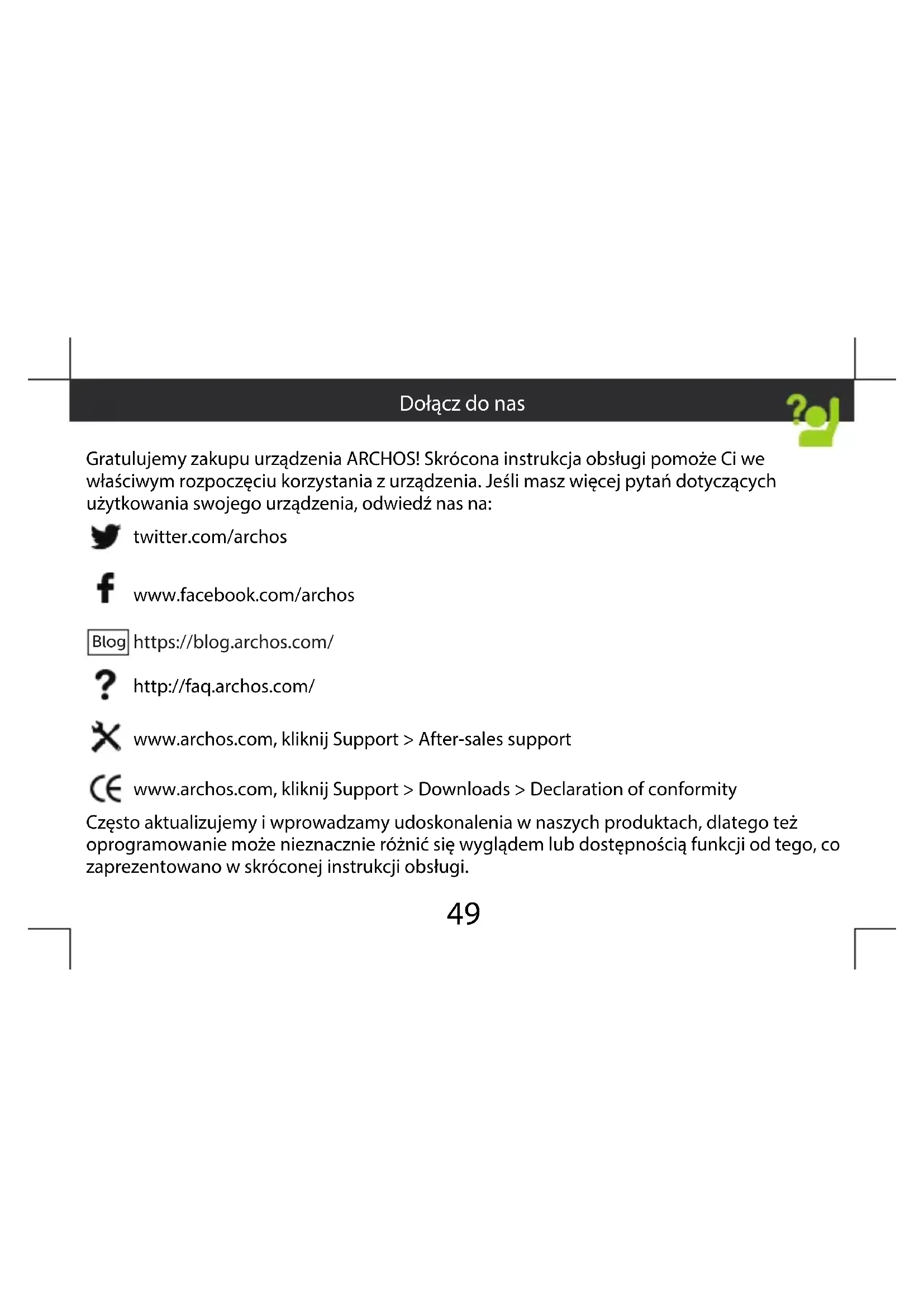 Gratulujemy zakupu urządzenia ARCHOS! Skrócona instrukcja obsługi pomoże Ci we właściwym rozpoczęciu korzystania z urządzenia. Jeśli masz więcej pytań dotyczących użytkowania swojego urządzenia, odwiedź nas na: twitter.com/archos www.facebook.com/archos Blog https://blog.archos.com/ http://faq.archos.com/ www.archos.com, kliknij Support > After-sales support www.archos.com, kliknij Support > Downloads > Declaration of conformity Często aktualizujemy iwprowadzamy udoskonalenia wnaszych produktach, dlatego też oprogramowanie może nieznacznie różnić się wyglądem lub dostępnością funkcji od tego, co zaprezentowano wskróconej instrukcji obsługi. Dołącz do nas50 Warranty W pudełku ARCHOS 55b Platinum Skrócona instrukcja obsługi Gwarancja, oświadczenia prawne i informacje dotyczące bezpieczeństwa Kabel do ładowania Ładowarka51 Opis urządzenia Wejście słuchawkowe Głośnik telefonu Kamera przednia Przycisk zasilania Przyciski regulacji głośności Ostatnio otwierane aplikacje Wstecz Ekran głównyz Kamera Latarka Port micro USB Głośnik52 Gdy rozpakujesz opakowanie ztelefonem komórkowym: