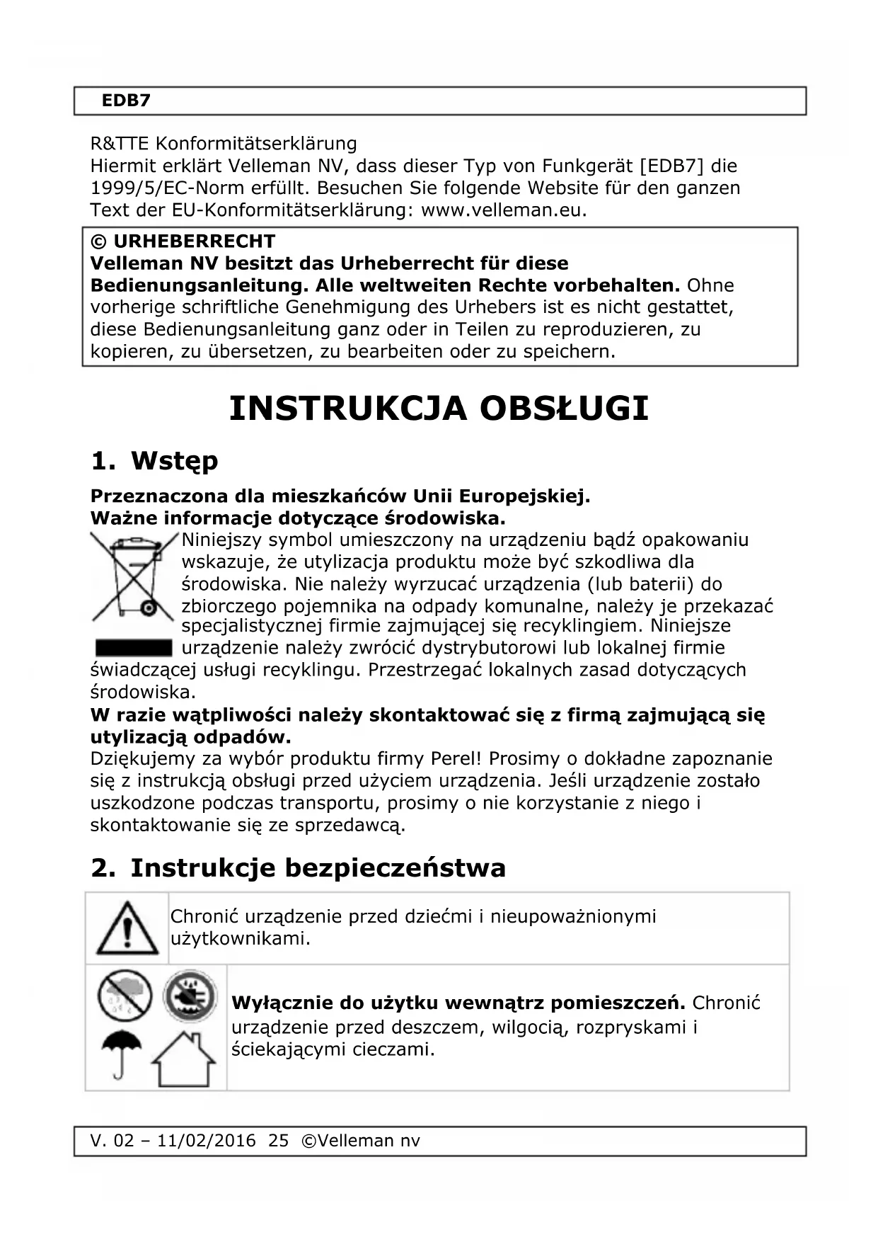 Należy używać tylko oryginalnych akcesoriów. Firma Velleman nv nie ponosi odpowiedzialności za uszkodzenia lub urazy wynikające z (niewłaściwego) korzystania z niniejszego urządzenia. Aby uzyskać więcej informacji dotyczących produktu oraz najnowszą wersję niniejszej instrukcji, należy odwiedzić naszą stronę internetową www.perel.eu. Informacje zawarte w niniejszej instrukcji obsługi mogą ulec zmianie bez wcześniejszego powiadomienia. R&TTE Deklaracja zgodności Velleman NV niniejszym oświadcza, że urządzenie radiowe typu [EDB7] jest zgodne z Dyrektywą 199/5/WE. Pełna treści deklaracji zgodności UE jest dostępna pod adresem internetowym: www.velleman.eu.