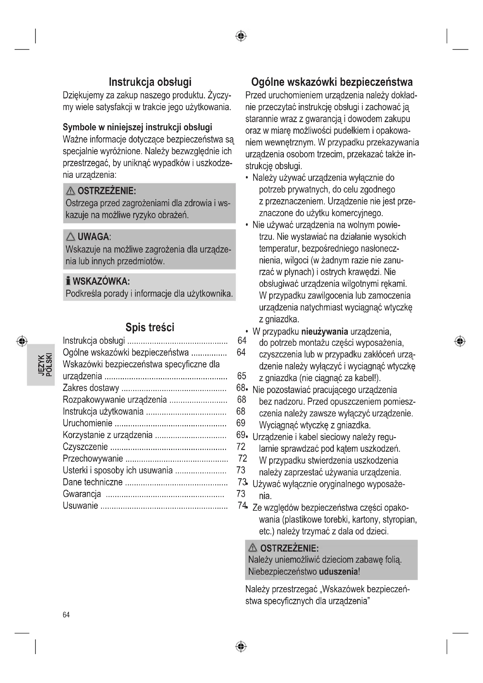 - Instrukcja obsługi Dziękujemyzazakupnaszegoproduktu.Życzy- mywielesatysfakcjiwtrakciejegoużytkowania. Symbole w niniejszej instrukcji obsługi Ważneinformacjedotyczącebezpieczeństwasą specjalniewyróżnione.Należybezwzględnieich przestrzegać,byuniknąćwypadkówiuszkodze- niaurządzenia: OSTRZEŻENIE: Ostrzegaprzedzagrożeniamidlazdrowiaiws- kazujenamożliweryzykoobrażeń. UWAGA: Wskazujenamożliwezagrożeniadlaurządze- nialubinnychprzedmiotów. WSKAZÓWKA: Podkreślaporadyiinformacjedlaużytkownika. Spis treści Instrukcjaobsługi p. 64