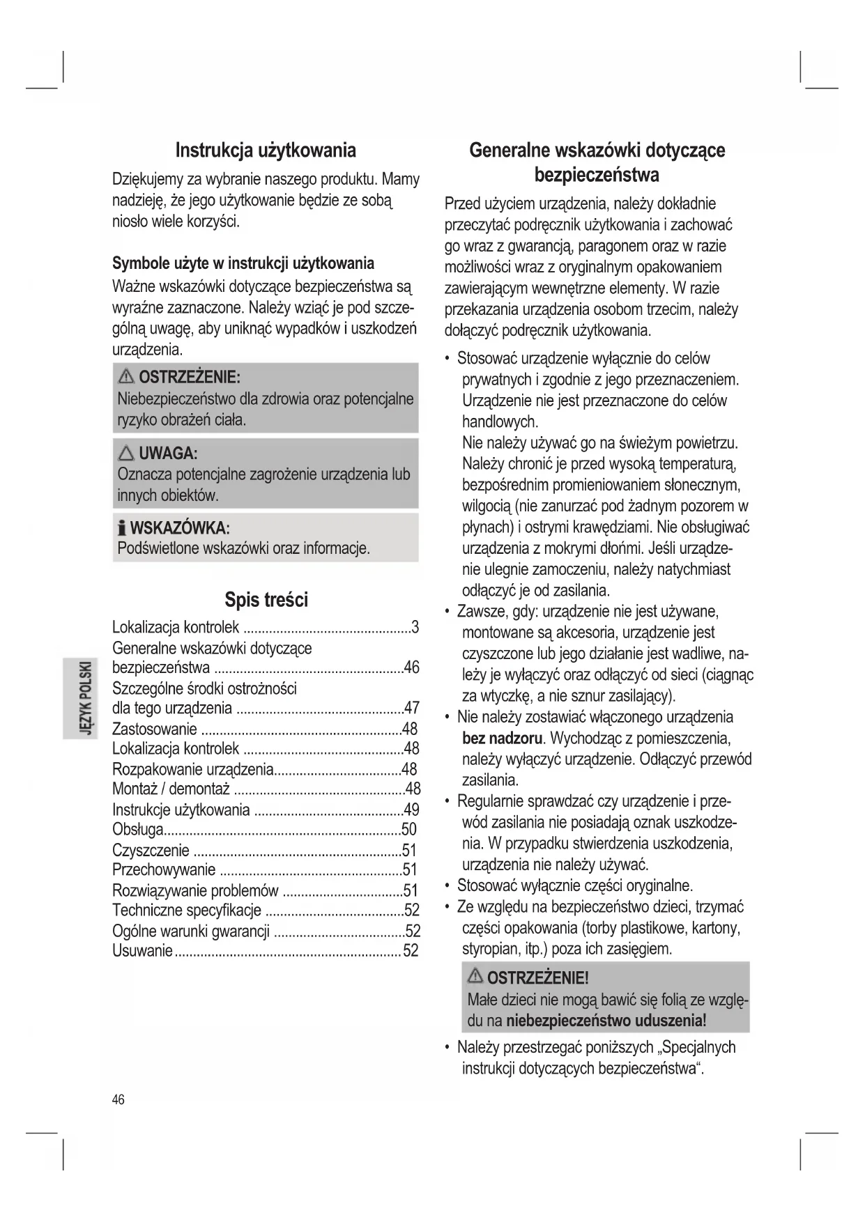- Należy przestrzegać poniższych „Specjalnych instrukcji dotyczących bezpieczeństwa“.47 Szczególne środki ostrożności dla tego urządzenia OSTRZEŻENIE: Ryzyko obrażeń!