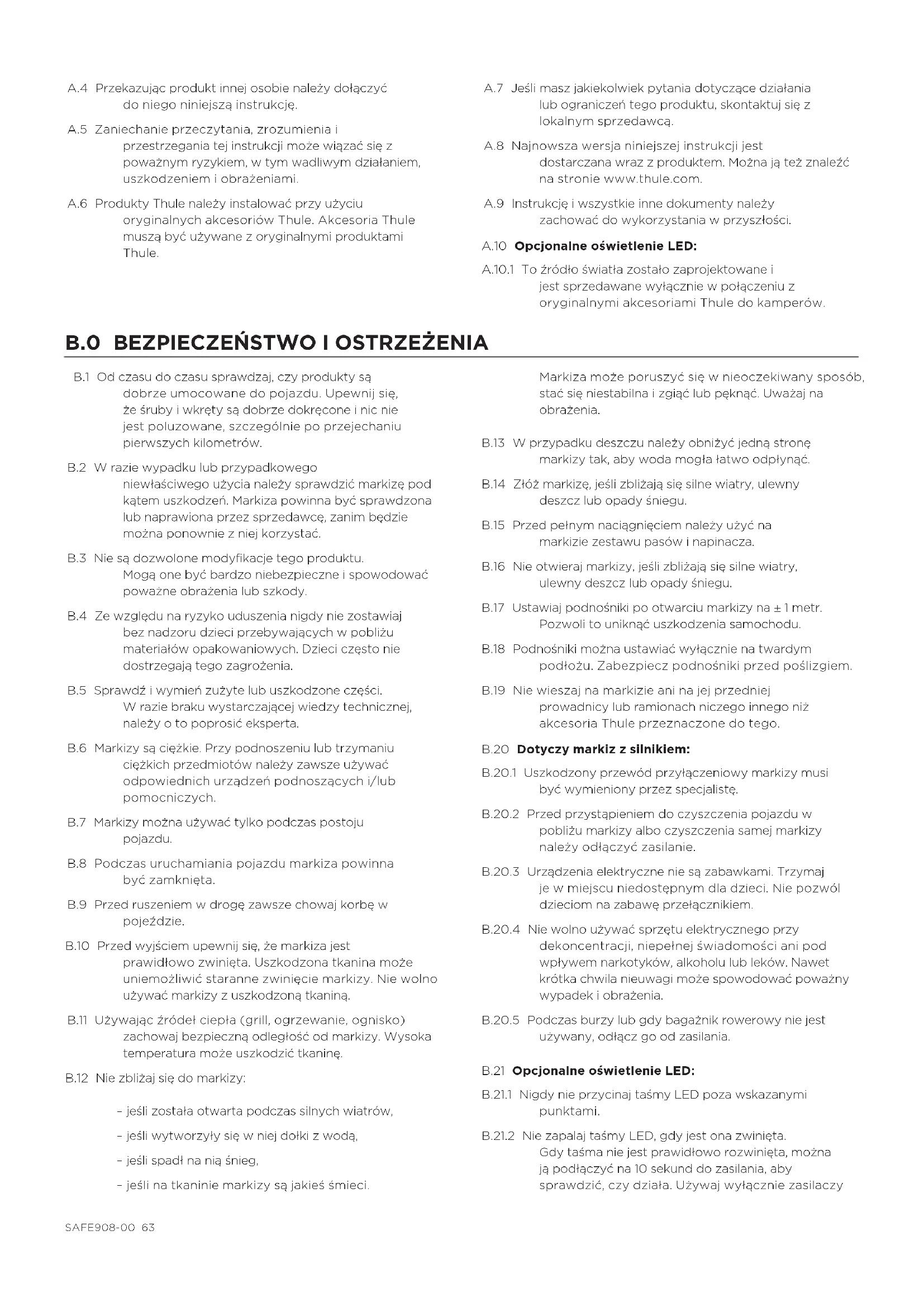A.1 Zalecenia dotyczące bezpieczeństwa i wszystkie instrukcje stanowią część produktu i zawierają ważne wskazówki dotyczące jego montażu oraz użytkowania. A.2 Wskazania te muszą być przestrzegane przez wszystkie osoby.A.3 Kopię niniejszej instrukcji należy pozostawić odpowiednim pracownikom.62 SAFE908-00A.4 Przekazując produkt innej osobie należy dołączyć do niego niniejszą instrukcję. A.5 Zaniechanie przeczytania, zrozumienia i przestrzegania tej instrukcji może wiązać się z poważnym ryzykiem, w tym wadliwym działaniem, uszkodzeniem i obrażeniami. A.6 Produkty Thule należy instalować przy użyciu oryginalnych akcesoriów Thule. Akcesoria Thule muszą być używane z oryginalnymi produktami Thule. A.7 Jeśli masz jakiekolwiek pytania dotyczące działania lub ograniczeń tego produktu, skontaktuj się z lokalnym sprzedawcą. A.8 Najnowsza wersja niniejszej instrukcji jest dostarczana wraz z produktem. Można ją też znaleźć na stronie www.thule.com. A.9 Instrukcję i wszystkie inne dokumenty należy zachować do wykorzystania w przyszłości. A.10 Opcjonalne oświetlenie LED: A.10.1 To źródło światła zostało zaprojektowane i jest sprzedawane wyłącznie w połączeniu z oryginalnymi akcesoriami Thule do kamperów.