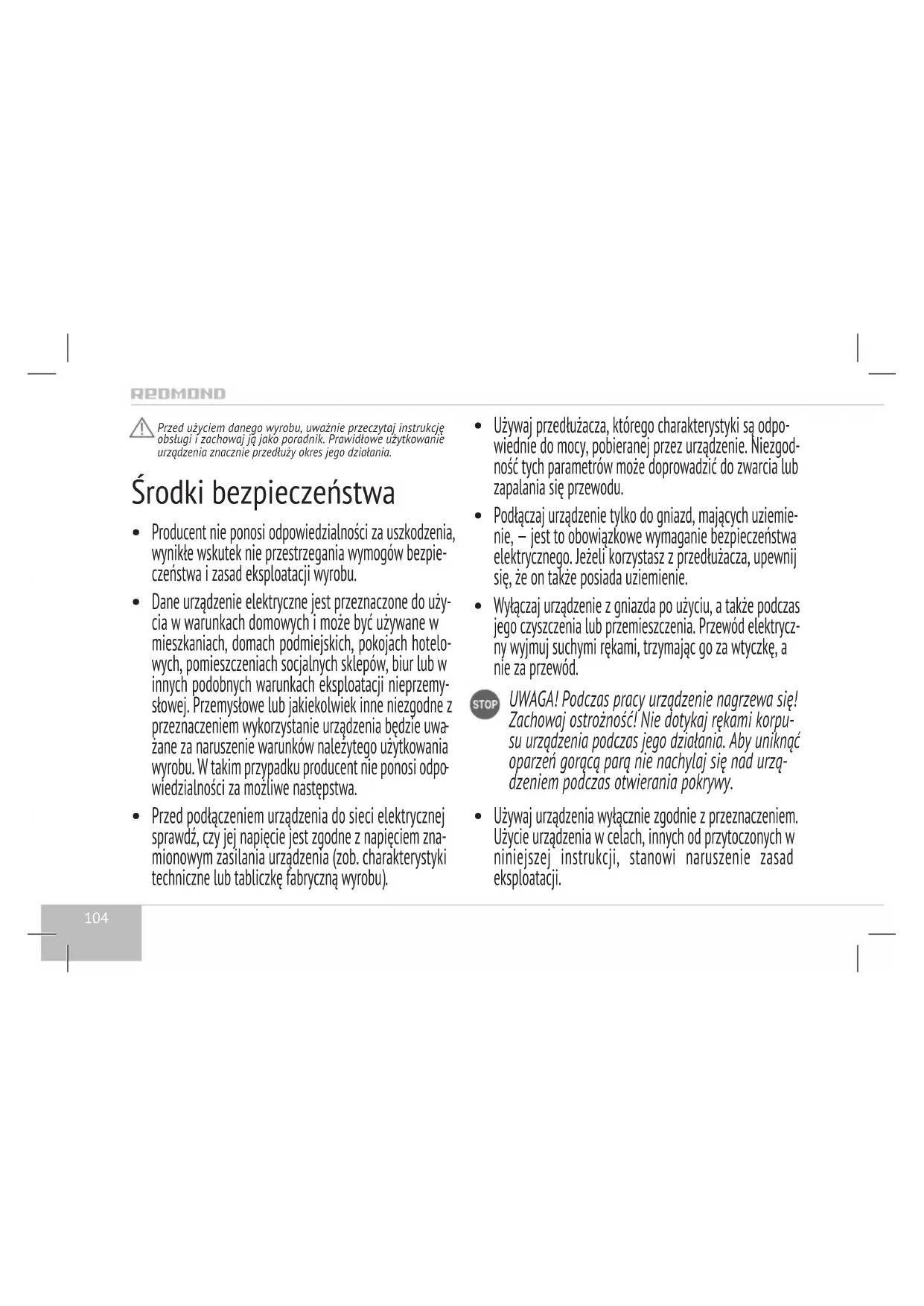 Zabronione jest użytkowanie urządzenia na otwartym po- wietrzu: dostanie się wilgoci do przewodu przyłączeniowe- go lub przedmiotów obcych do wnętrza korpusu urządzenia może doprowadzić do jego poważnych uszkodzeń.