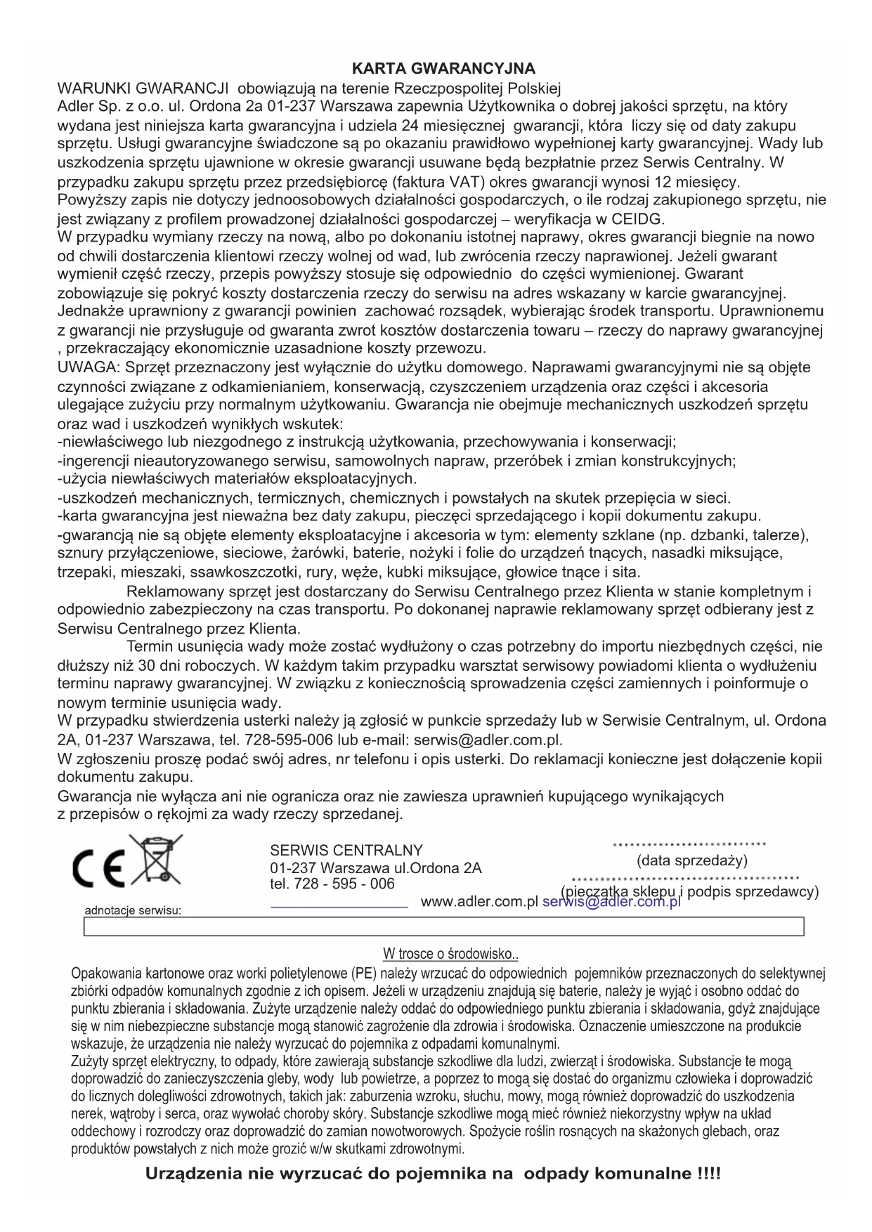 - Përputhshmëria elektromagnetike (EMC) Pajisja e shënuar me shenjën CE në etiketën e vlerësimit Pajisja është bërë në klasën II të izolimit. Pajisja është në përputhje me direktivat e BE-së: - Direktiva e tensionit të ulët (LVD)W przypadku wymiany rzeczy na nową, albo po dokonaniu istotnej naprawy, okres gwarancji biegnie na nowo od chwili dostarczenia klientowi rzeczy wolnej od wad, lub zwrócenia rzeczy naprawionej. Jeżeli gwarant wymienił część rzeczy, przepis powyższy stosuje się odpowiednio do części wymienionej. Gwarant zobowiązuje się pokryć koszty dostarczenia rzeczy do serwisu na adres wskazany w karcie gwarancyjnej. Jednakże uprawniony z gwarancji powinien zachować rozsądek, wybierając środek transportu. Uprawnionemu z gwarancji nie przysługuje od gwaranta zwrot kosztów dostarczenia towaru – rzeczy do naprawy gwarancyjnej , przekraczający ekonomicznie uzasadnione koszty przewozu. UWAGA: Sprzęt przeznaczony jest wyłącznie do użytku domowego. Naprawami gwarancyjnymi nie są objęte czynności związane z odkamienianiem, konserwacją, czyszczeniem urządzenia oraz części i akcesoria ulegające zużyciu przy normalnym użytkowaniu. Gwarancja nie obejmuje mechanicznych uszkodzeń sprzętu oraz wad i uszkodzeń wynikłych wskutek: Termin usunięcia wady może zostać wydłużony o czas potrzebny do importu niezbędnych części, nie dłuższy niż 30 dni roboczych. W każdym takim przypadku warsztat serwisowy powiadomi klienta o wydłużeniu terminu naprawy gwarancyjnej. W związku z koniecznością sprowadzenia części zamiennych i poinformuje o nowym terminie usunięcia wady. Powyższy zapis nie dotyczy jednoosobowych działalności gospodarczych, o ile rodzaj zakupionego sprzętu, nie jest związany z profilem prowadzonej działalności gospodarczej – weryfikacja w CEIDG. W zgłoszeniu proszę podać swój adres, nr telefonu i opis usterki. Do reklamacji konieczne jest dołączenie kopii dokumentu zakupu. -uszkodzeń mechanicznych, termicznych, chemicznych i powstałych na skutek przepięcia w sieci. KARTA GWARANCYJNA -ingerencji nieautoryzowanego serwisu, samowolnych napraw, przeróbek i zmian konstrukcyjnych; Adler Sp. z o.o. ul. Ordona 2a 01-237 Warszawa zapewnia Użytkownika o dobrej jakości sprzętu, na który wydana jest niniejsza karta gwarancyjna i udziela 24 miesięcznej gwarancji, która liczy się od daty zakupu sprzętu. Usługi gwarancyjne świadczone są po okazaniu prawidłowo wypełnionej karty gwarancyjnej. Wady lub uszkodzenia sprzętu ujawnione w okresie gwarancji usuwane będą bezpłatnie przez Serwis Centralny. W przypadku zakupu sprzętu przez przedsiębiorcę (faktura VAT) okres gwarancji wynosi 12 miesięcy. -użycia niewłaściwych materiałów eksploatacyjnych. WARUNKI GWARANCJI obowiązują na terenie Rzeczpospolitej Polskiej -karta gwarancyjna jest nieważna bez daty zakupu, pieczęci sprzedającego i kopii dokumentu zakupu. -gwarancją nie są objęte elementy eksploatacyjne i akcesoria w tym: elementy szklane (np. dzbanki, talerze), sznury przyłączeniowe, sieciowe, żarówki, baterie, nożyki i folie do urządzeń tnących, nasadki miksujące, trzepaki, mieszaki, ssawkoszczotki, rury, węże, kubki miksujące, głowice tnące i sita. Reklamowany sprzęt jest dostarczany do Serwisu Centralnego przez Klienta w stanie kompletnym i odpowiednio zabezpieczony na czas transportu. Po dokonanej naprawie reklamowany sprzęt odbierany jest z Serwisu Centralnego przez Klienta. W przypadku stwierdzenia usterki należy ją zgłosić w punkcie sprzedaży lub w Serwisie Centralnym, ul. Ordona 2A, 01-237 Warszawa, tel. 728-595-006 lub e-mail: serwis@adler.com.pl. Gwarancja nie wyłącza ani nie ogranicza oraz nie zawiesza uprawnień kupującego wynikających -niewłaściwego lub niezgodnego z instrukcją użytkowania, przechowywania i konserwacji; z przepisów o rękojmi za wady rzeczy sprzedanej. SERWIS CENTRALNY 01-237 Warszawa ul.Ordona 2A tel. 728 - 595 - 006 www.adler.com.pl serwis@adler.com.pl (data sprzedaży) (pieczątka sklepu i podpis sprzedawcy) adnotacje serwisu: Urządzenia nie wyrzucać do pojemnika na odpady komunalne !!!! Zużyty sprzęt elektryczny, to odpady, które zawierają substancje szkodliwe dla ludzi, zwierząt i środowiska. Substancje te mogą doprowadzić do zanieczyszczenia gleby, wody lub powietrze, a poprzez to mogą się dostać do organizmu człowieka i doprowadzić do licznych dolegliwości zdrowotnych, takich jak: zaburzenia wzroku, słuchu, mowy, mogą również doprowadzić do uszkodzenia nerek, wątroby i serca, oraz wywołać choroby skóry. Substancje szkodliwe mogą mieć również niekorzystny wpływ na układ oddechowy i rozrodczy oraz doprowadzić do zamian nowotworowych. Spożycie roślin rosnących na skażonych glebach, oraz produktów powstałych z nich może grozić w/w skutkami zdrowotnymi. W trosce o środowisko.. Opakowania kartonowe oraz worki polietylenowe (PE) należy wrzucać do odpowiednich pojemników przeznaczonych do selektywnej zbiórki odpadów komunalnych zgodnie z ich opisem. Jeżeli w urządzeniu znajdują się baterie, należy je wyjąć i osobno oddać do punktu zbierania i składowania. Zużyte urządzenie należy oddać do odpowiedniego punktu zbierania i składowania, gdyż znajdujące się w nim niebezpieczne substancje mogą stanowić zagrożenie dla zdrowia i środowiska. Oznaczenie umieszczone na produkcie wskazuje, że urządzenia nie należy wyrzucać do pojemnika z odpadami komunalnymi.59
