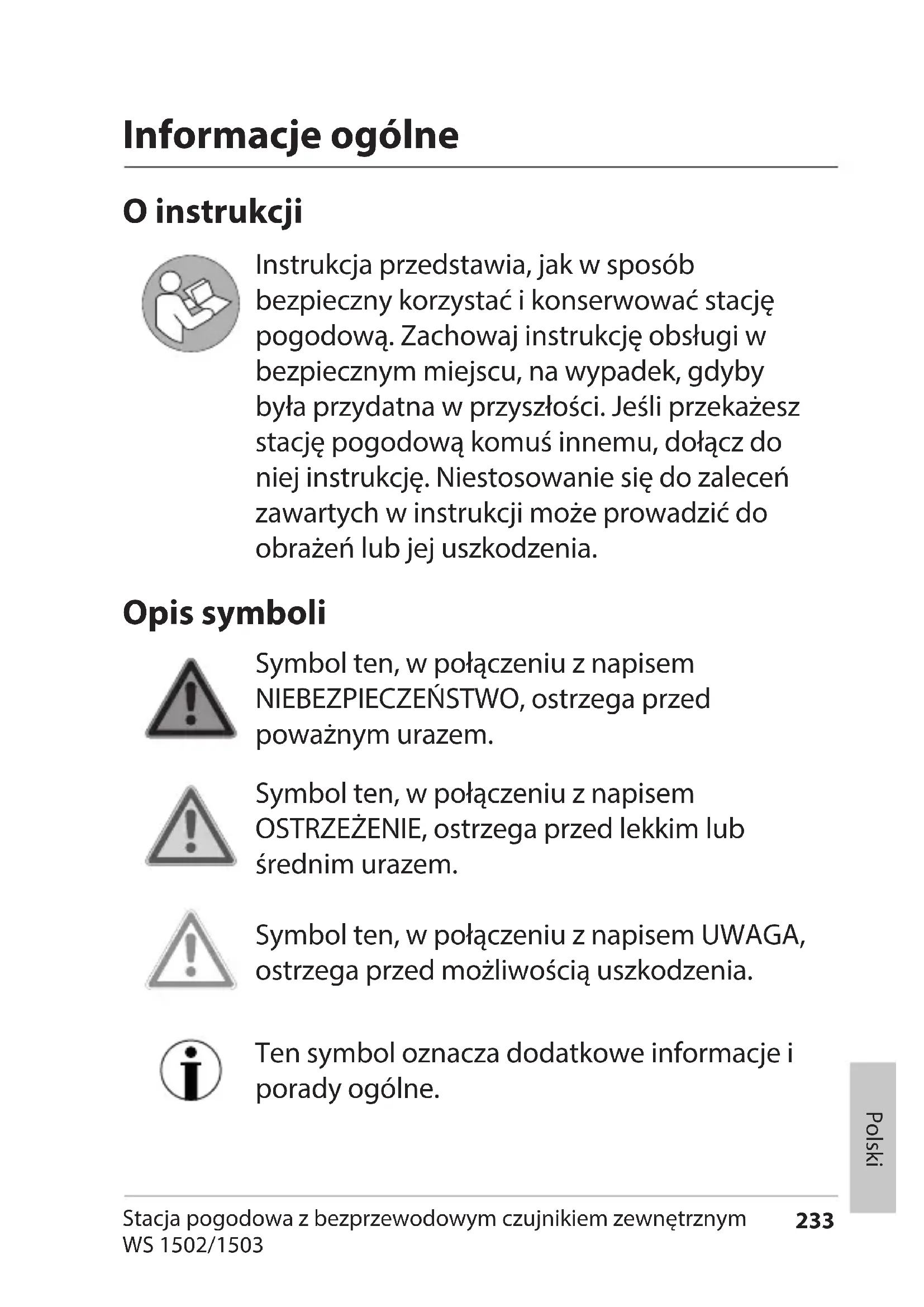 Instrukcja przedstawia, jak w sposób bezpieczny korzystać i konserwować stację pogodową. Zachowaj instrukcję obsługi w bezpiecznym miejscu, na wypadek, gdyby była przydatna w przyszłości. Jeśli przekażesz stację pogodową komuś innemu, dołącz do niej instrukcję. Niestosowanie się do zaleceń zawartych w instrukcji może prowadzić do obrażeń lub jej uszkodzenia.