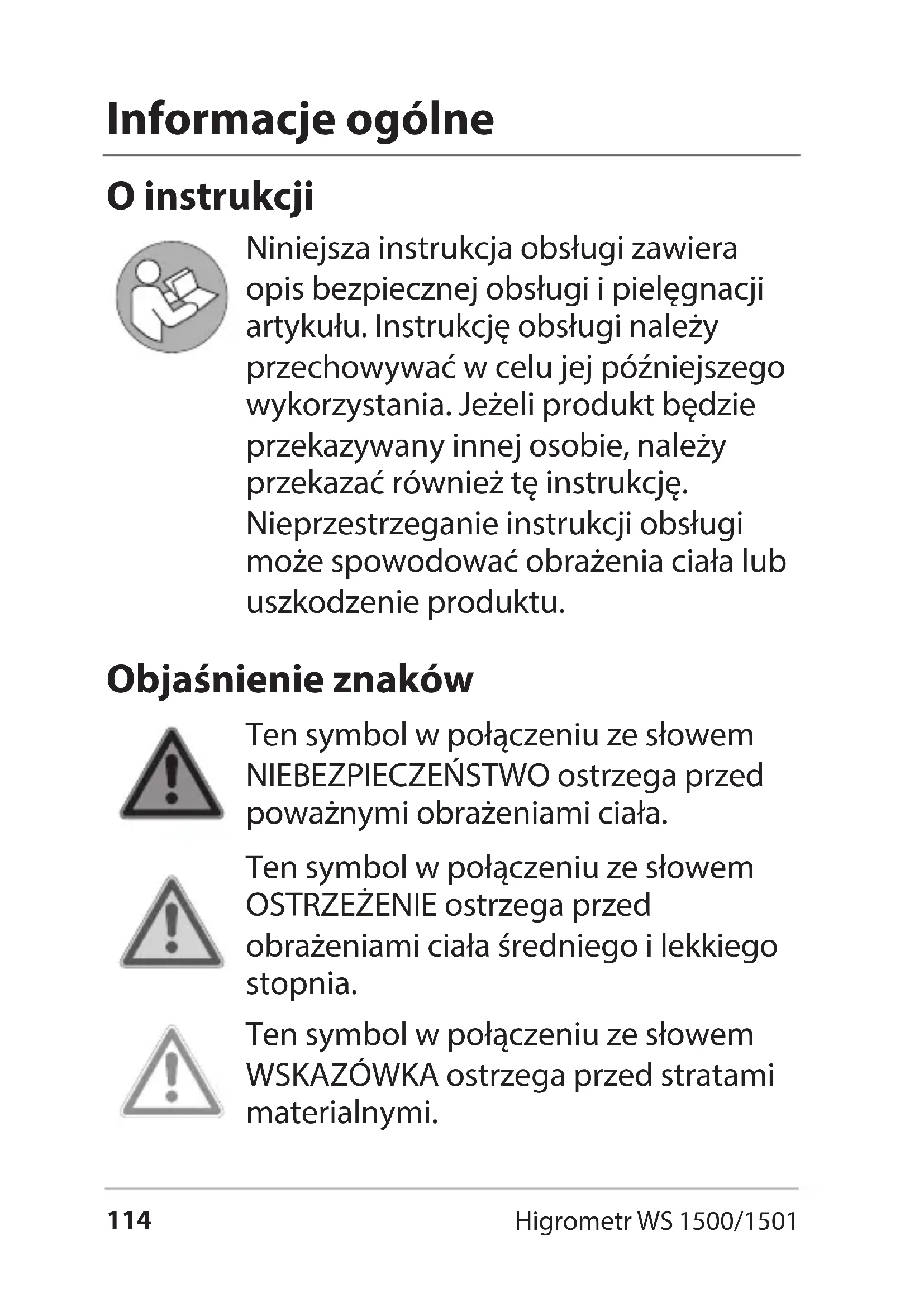 - Utylizacja 14 Higrometr WS 1500/1501 Informacje ogólne O instrukcji Niniejsza instrukcja obsługi zawiera opis bezpiecznej obsługi i pielęgnacji artykułu. Instrukcję obsługi należy przechowywać w celu jej późniejszego wykorzystania. Jeżeli produkt będzie przekazywany innej osobie, należy przekazać również tę instrukcję. Nieprzestrzeganie instrukcji obsługi może spowodować obrażenia ciała lub uszkodzenie produktu. Objaśnienie znaków Ten symbol w połączeniu ze słowem NIEBEZPIECZEŃSTWO ostrzega przed poważnymi obrażeniami ciała. Ten symbol w połączeniu ze słowem OSTRZEŻENIE ostrzega przed obrażeniami ciała średniego i lekkiego stopnia. Ten symbol w połączeniu ze słowem WSKAZÓWKA ostrzega przed stratami materialnymi.115 Higrometr WS 1500/1501 Polski Ten symbol oznacza dodatkowe informacje i ogólne wskazówki. Użycie zgodne z przeznaczeniem Ten higrometr służy do pomiaru temperatury w pomieszczeniu oraz wilgotności powietrza, a tym samym do kontroli klimatu w pomieszczeniu. Higrometr nie jest przystosowany do użycia komercyjnego. Bezpieczeństwo Ten produkt może być używany przez dzieci w wielu do lat 8 oraz przez osoby z ograniczonymi zdolnościami zycznymi, senso- rycznymi lub umysłowymi, bądź którym brakuje doświadczenia i wiedzy tylko wtedy, gdy są nadzo- rowane lub przeszły przeszkolenie z zakresu bezpiecznego użytkowa-116 Higrometr WS 1500/1501 nia produktu i rozumieją wynika- jące z tego niebezpieczeństwa. Dzieci nie mogą bawić się produk- tem. Dzieci nie mogą czyścić ani serwi- sować urządzenia, chyba że mają 8lat lub więcej i są nadzorowane. Połknięcie baterii stanowi zagroże- nie dla życia. Urządzenie i baterie należy przechowywać w miejscu niedostępnym dla małych dzieci. W przypadku połknięcia baterii należy natychmiast zwrócić się o pomoc medyczną. NIEBEZPIECZEŃSTWO dla dzieci Materiały opakowaniowe należy przechowywać z dala od dzieci. Połknięcie grozi uduszeniem. Zwracać uwagę na to, aby torby opakowaniowej nie nakładano na głowę.117 Higrometr WS 1500/1501 Polski NIEBEZPIECZEŃSTWO pożaru/obrażeń i/lub wybuchu Niebezpieczeństwo wybuchu w przypadku niewłaściwej wymiany baterii. Baterie należy wymieniać tylko na takie same lub na typ o takich samych właściwościach. Przestrzegać “danych technicznych”. Baterii nie wolno ładować, reaktywować w inny sposób, rozkładać na części, wrzucać w ogień lub powodować ich zwarcia. W przeciwnym razie występuje podwyższone niebezpieczeństwo wybuchu i wycieku, poza tym mogą ulatniać się gazy! Proszę unikać kontaktu cieczy baterii ze skórą, oczami i błonami śluzowymi. W przypadku kontaktu, miejsce styku należy natychmiast obcie spluwać czysta wodą i bezpośrednio po tym udać się do lekarza. OSTROŻNIE - straty materialne Nie zanurzać artykułu w wodzi lub w innych płynach. Proszę chronić urządzenie przed mocnym uderzeniem i wstrząsami. Wyjąć baterie z urządzenia, jeżeli są wyczerpane lub urządzenie nie będzie118 Higrometr WS 1500/1501 użytkowane przez dłuższy czas. W ten sposób unika się uszkodzeń, jakie mogą powstać na skutek wycieku. Podczas wkładania i wymiany baterii należy zwrócić uwagę na prawidłową biegunowość(+/-). Nie narażać baterii na oddziaływanie skrajnych warunków poprzez np. układanie ich na grzejnikach lub bezpośrednio w miejscach nasłonecznionych. Podwyższone niebezpieczeństwo wycieku! W razie potrzeby przed włożeniem należy wyczyścić styki baterii i urządzenia. Stosować tylko baterie tego samego typu, nie używać różnych typów ani nie mieszać zużytych i nowych baterii. Nie modykować produktu. Naprawy zlecać tylko specjalistom. Nieprawidłowo wykonane naprawy mogą spowodować poważne zagrożenia dla użytkownika.119 Higrometr WS 1500/1501 Polski Informacje o lokalizacji NIEBEZPIECZEŃSTWO poważnych obrażeń ciała − W przypadku instalacji ściennej w miejscu montażu nie wolno układać w ścianie kabli elektrycznych, rur gazu lub wody. Podczas wiercenia otworów występuje niebezpieczeństwo porażenia prądem! Z tyłu urządzenia znajduje się rozkładana nóżka oraz zaczep do zawieszania służący do mocowania na ścianie. Należy w miarę możliwości wybrać lokalizację, w której urządzenie nie będzie narażone na bezpośrednie działanie promieni słonecznych.120 Higrometr WS 1500/1501 W skrócie p. 1321