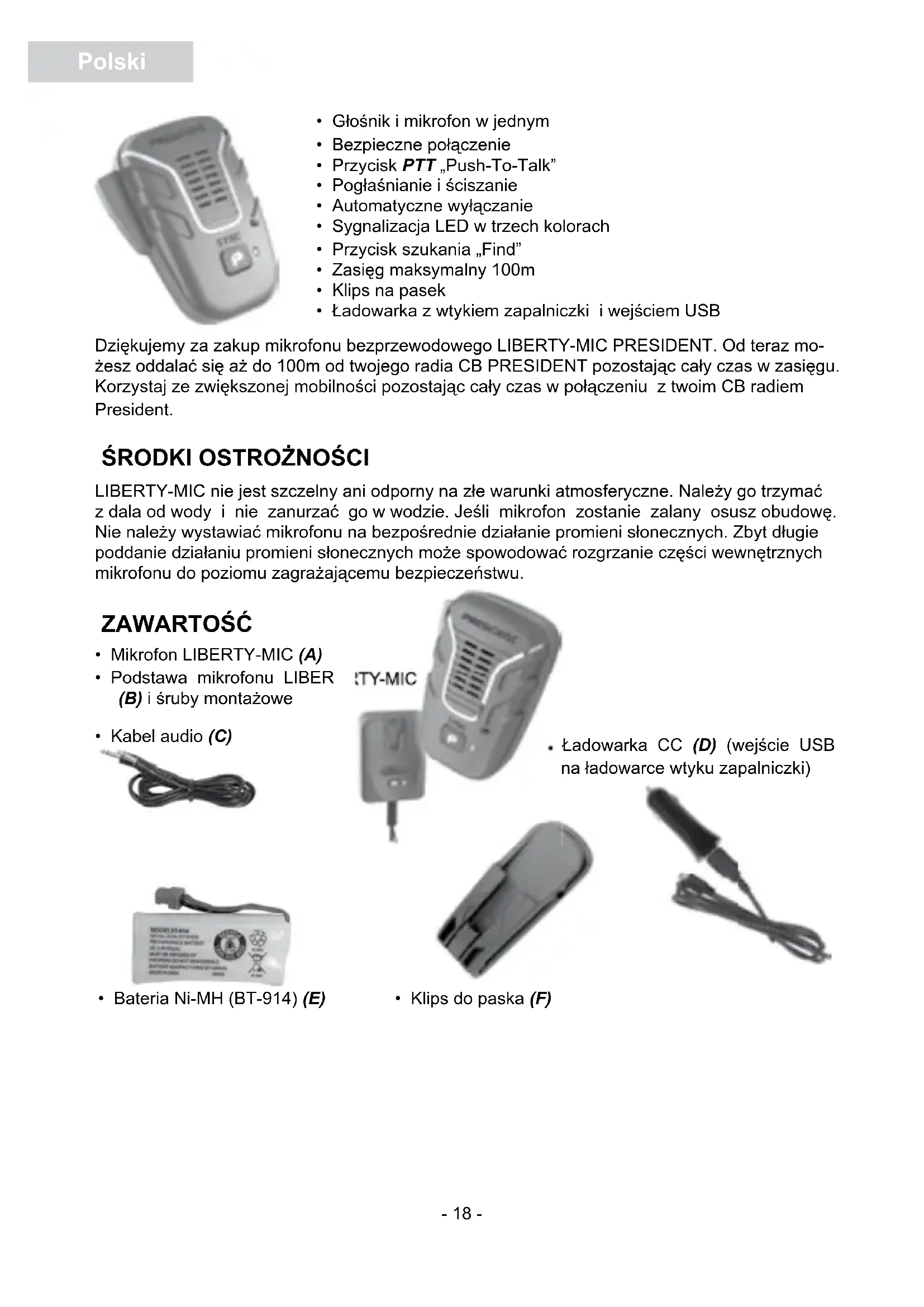 - Ładowarka z wtykiem zapalniczki i wejściem USB Dziękujemy za zakup mikrofonu bezprzewodowego LIBERTY-MIC PRESIDENT. Od teraz mo- żesz oddalać się aż do 100m od twojego radia CB PRESIDENT pozostając cały czas w zasięgu. Korzystaj ze zwiększonej mobilności pozostając cały czas w połączeniu z twoim CB radiem President.