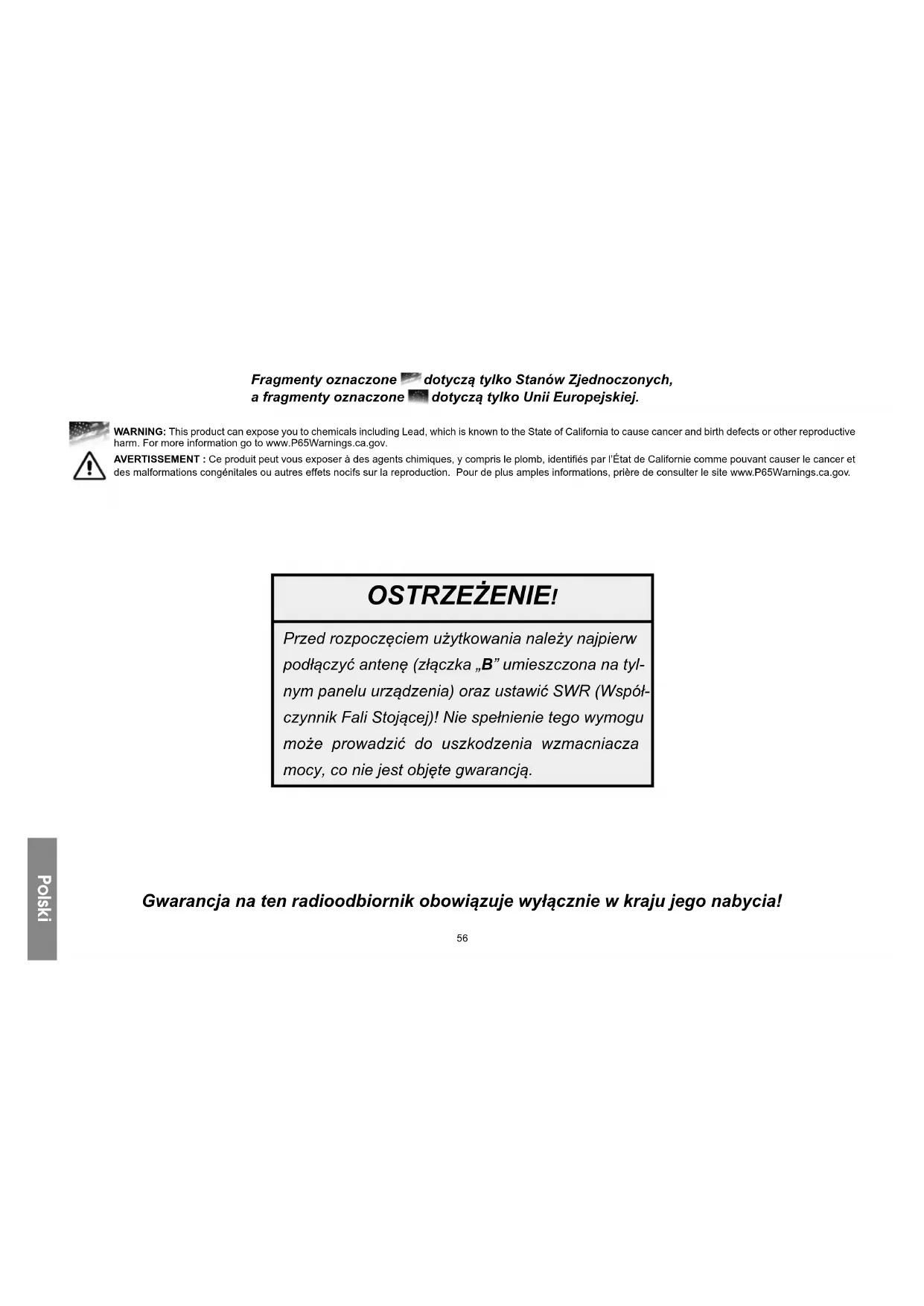 Gerente da Qualidade Português Registro de Garantia56 OSTRZEŻENIE! Przed rozpoczęciem użytkowania należy najpierw podłączyć antenę (złączka „B” umieszczona na tyl- nym panelu urządzenia) oraz ustawić SWR (Współ- czynnik Fali Stojącej)! Nie spełnienie tego wymogu może prowadzić do uszkodzenia wzmacniacza mocy, co nie jest objęte gwarancją. Gwarancja na ten radioodbiornik obowiązuje wyłącznie w kraju jego nabycia! Polski Fragmenty oznaczone dotyczą tylko Stanów Zjednoczonych, a fragmenty oznaczone dotyczą tylko Unii Europejskiej. WARNING: This product can expose you to chemicals including Lead, which is known to the State of California to cause cancer and birth defects or other reproductive harm. For more information go to www.P65Warnings.ca.gov. AVERTISSEMENT : Ce produit peut vous exposer à des agents chimiques, y compris le plomb, identifiés par l’État de Californie comme pouvant causer le cancer et des malformations congénitales ou autres effets nocifs sur la reproduction. Pour de plus amples informations, prière de consulter le site www.P65Warnings.ca.gov.57 Witamy w świecie łączności z nową generacją radioodbiorników CB. Nowe modele PRESIDENT dają ci możliwość użytkowania sprzętu CB charakteryzującego się najlepszą sprawnością. Dzięki najnowocześniejszej technologii gwarantującej nieocenioną jakość, wasz PRESIDENT LINCOLN II + ASC stanowi nowy krok w komunikacji cywilnej oraz jest najlepszym wyborem dla najbardziej wymagających profesjonalnych użytkowników CB radia. Aby mieć pewność właściwego wykorzystania możliwości sprzętu, przed zainstalowaniem i użytkowaniem modelu PRESIDENT LINCOLN II + ASC zalecamy dokładne przeczytanie niniejszej Instrukcji obsługi. A) INSTALACJA